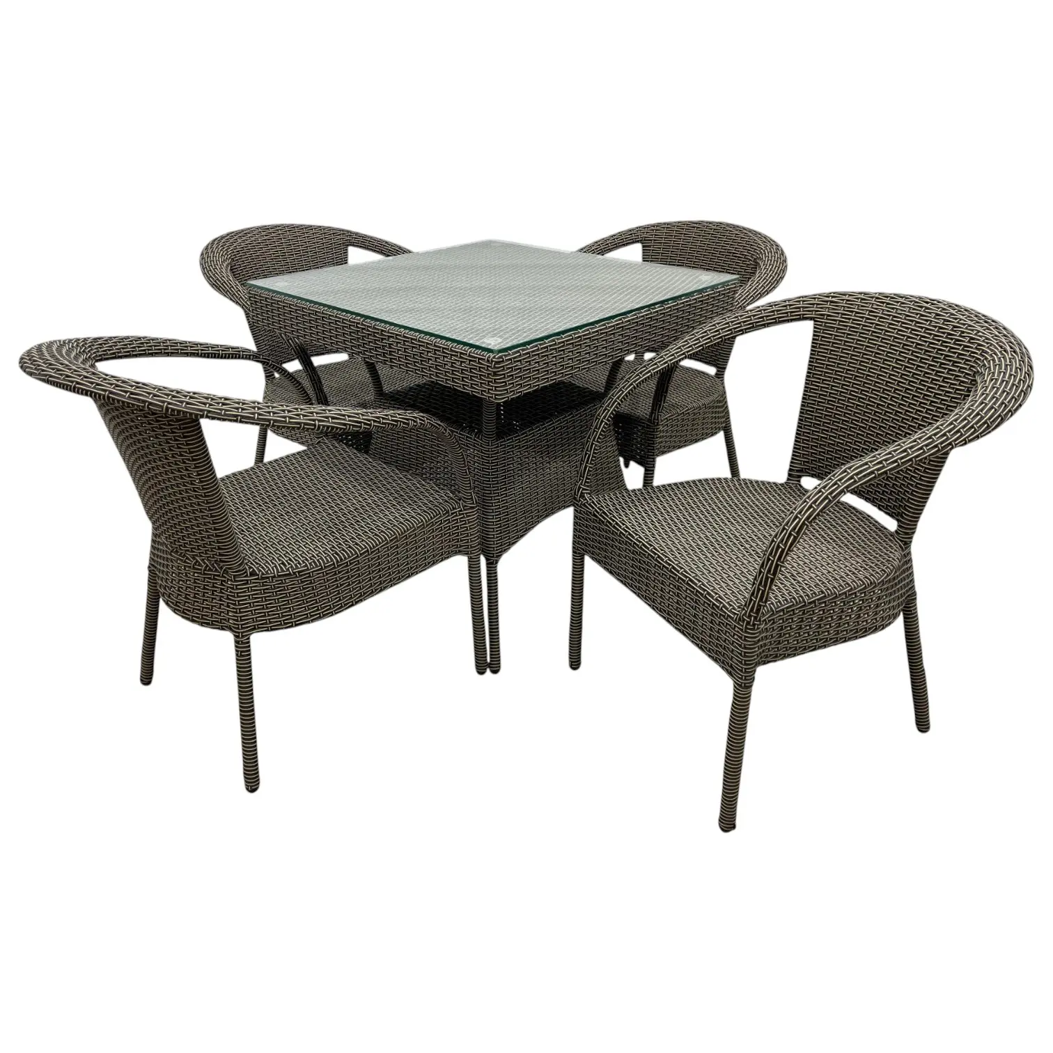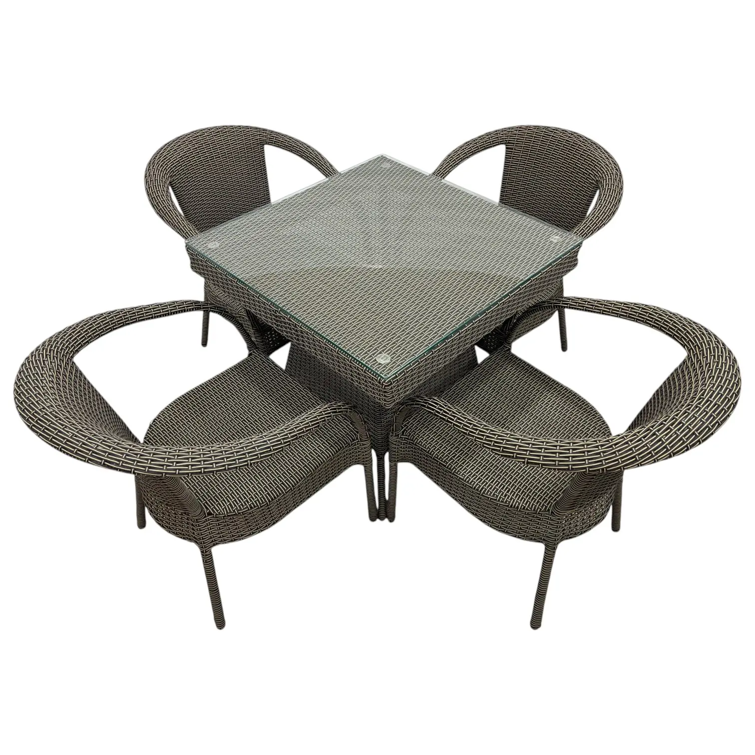 This complete 4-piece patio set includes one square dining table with a tempered glass tabletop and four matching curved-back dining chairs. Constructed from durable, weather-resistant gray synthetic wicker (poly-rattan), this set is designed to withstand the elements while providing comfortable, stylish seating for four on your deck or patio.