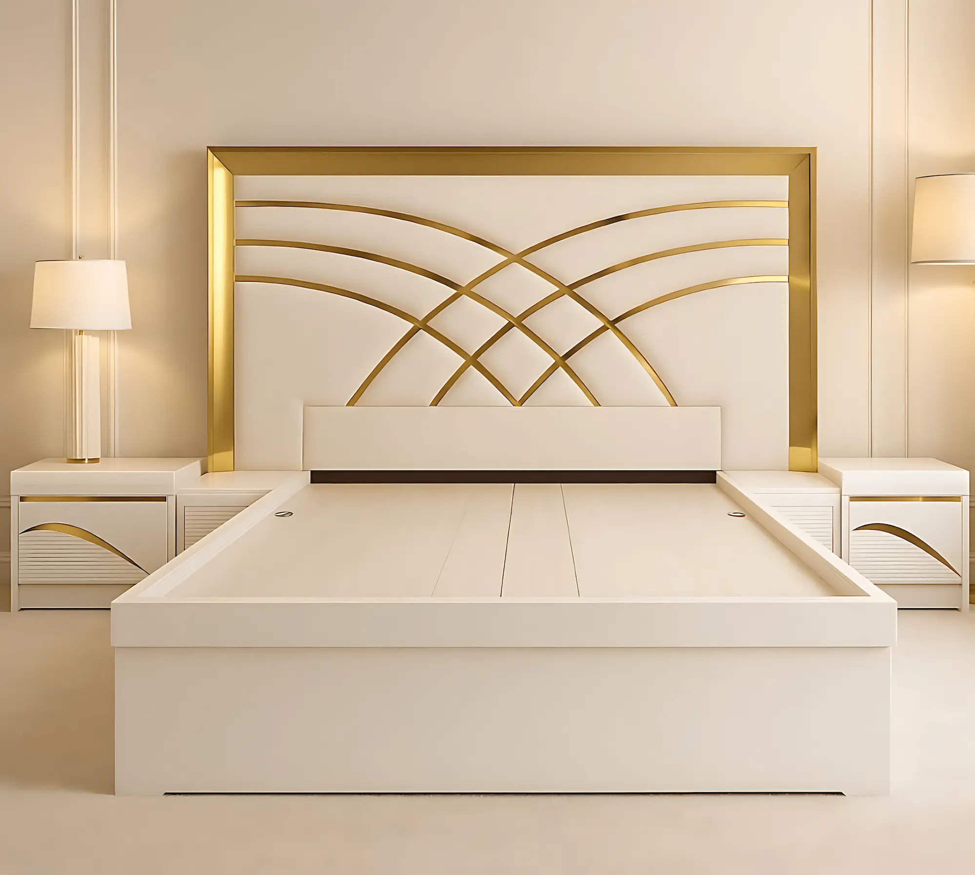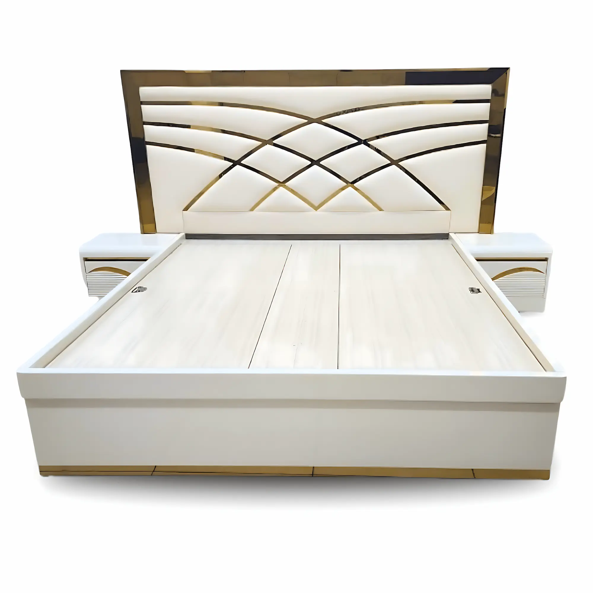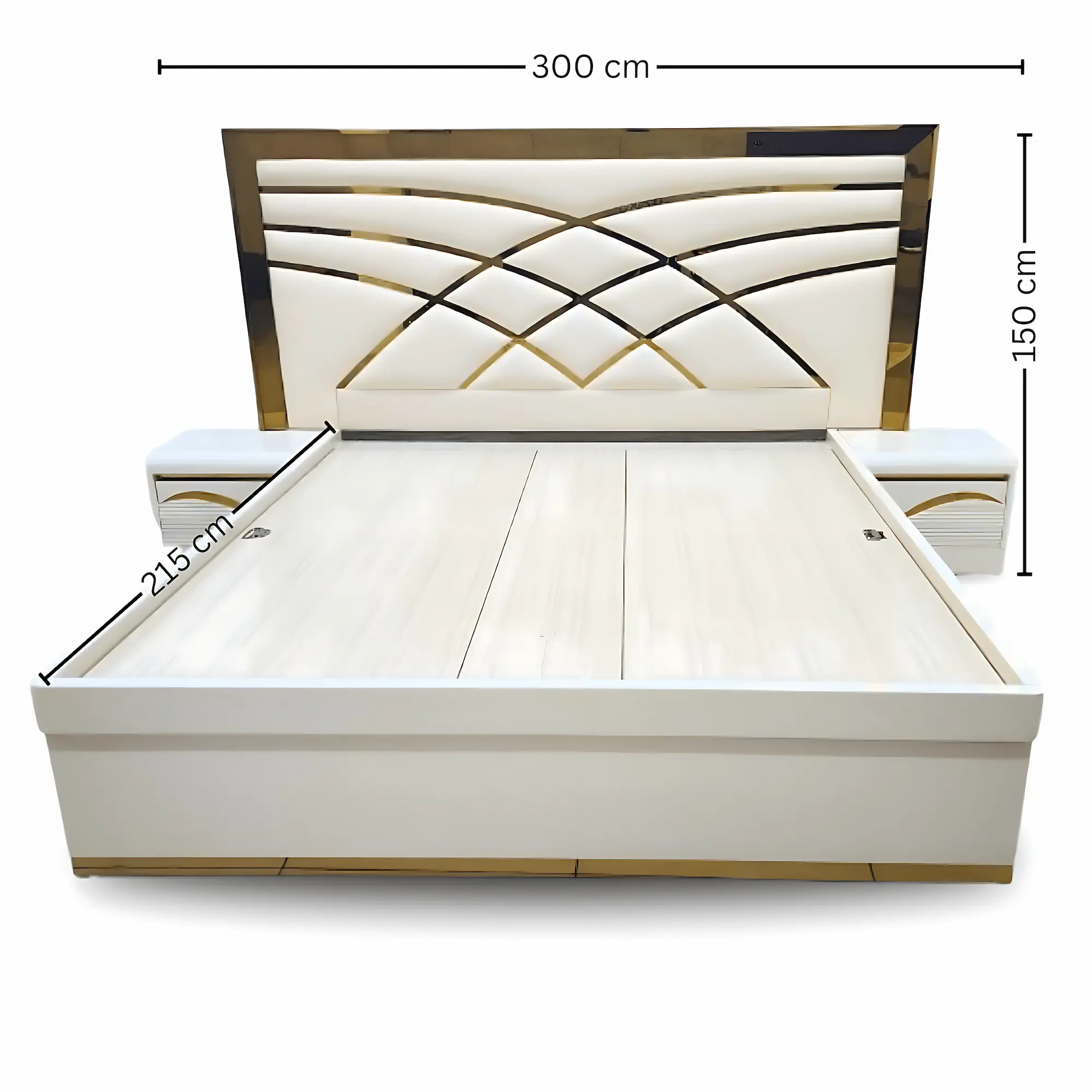 Give your bedroom a touch of luxury with this stunning king size bed. Featuring a beautifully upholstered headboard with elegant golden accents, a sleek white frame, and durable design, this bed combines comfort, style, and sophistication. Perfect for modern interiors.