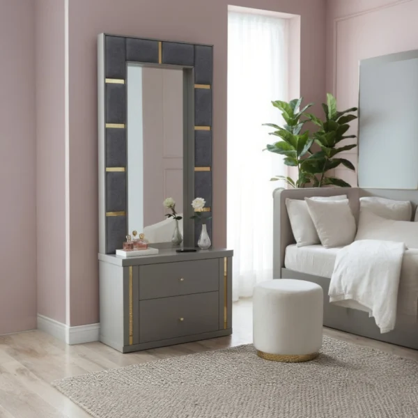 A chic dresser unit featuring a deep rectangular mirror framed by quilted upholstery, subtle gold accents, and two smooth-gliding storage drawers.