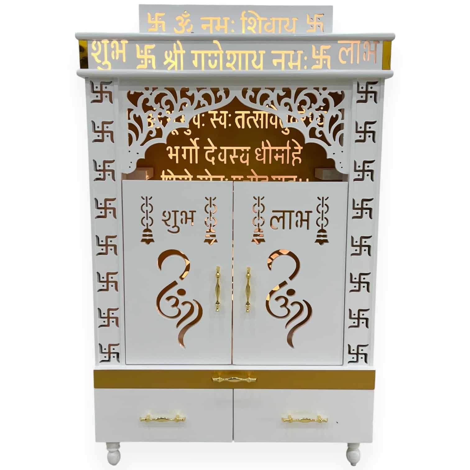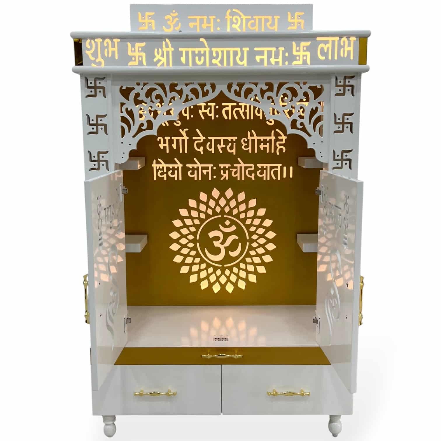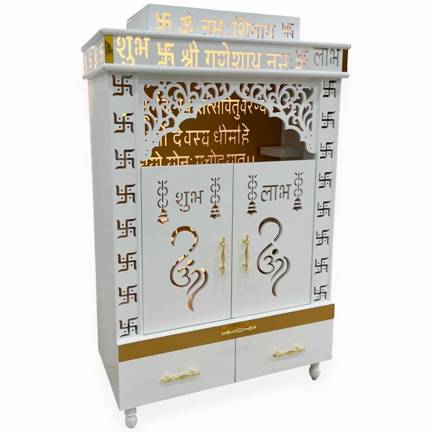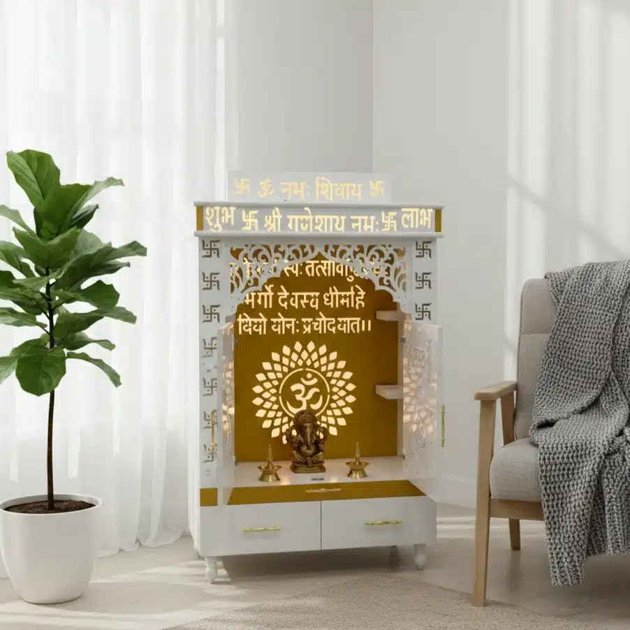 A sleek, floor-standing home Mandir in white and gold, featuring intricate laser-cut designs and warm LED illumination.