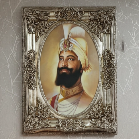This regal portrait features Guru Gobind Singh Ji, the tenth Sikh Guru, wearing a distinctive Kalgi (turban ornament).