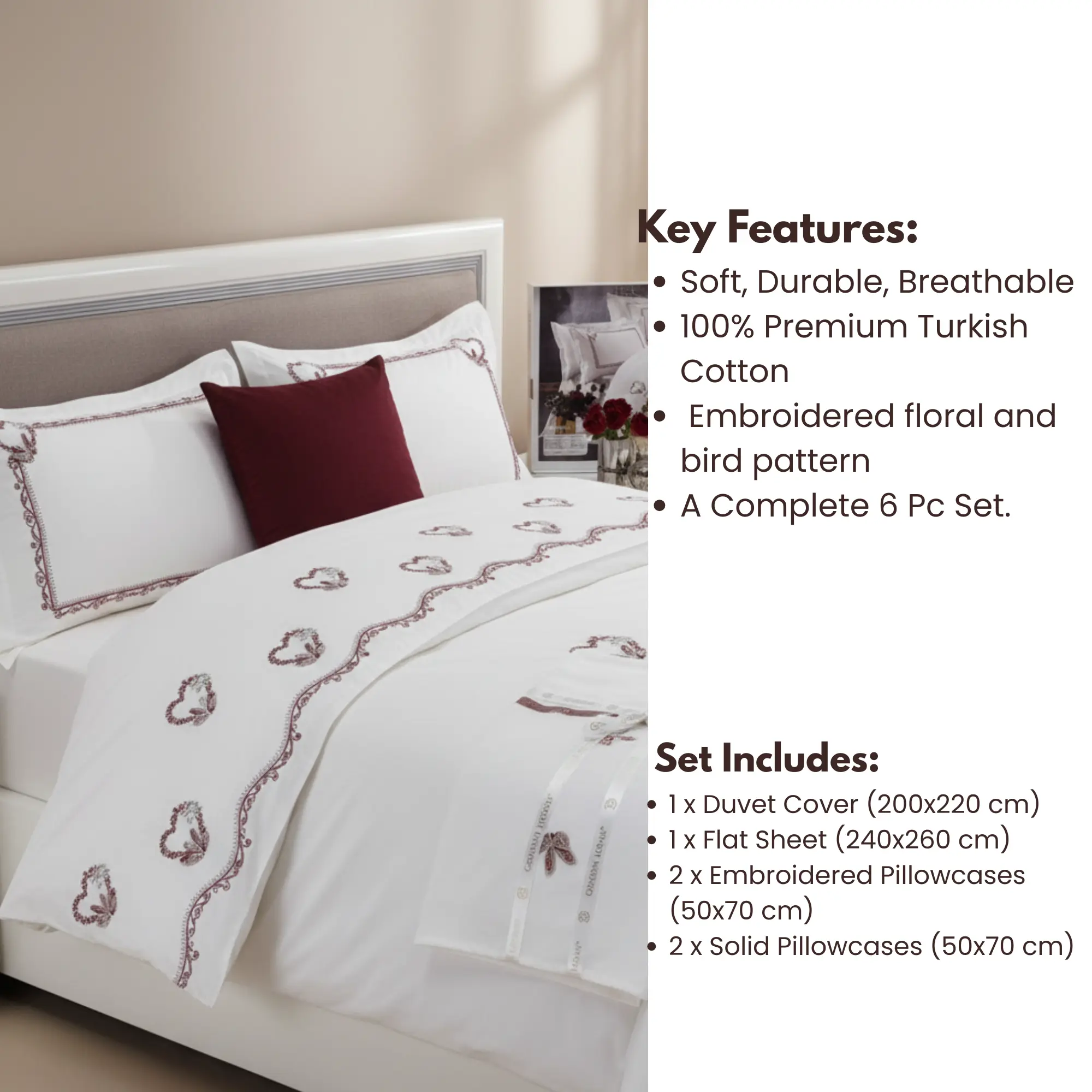 Demet White & Burgundy Heart Embroidered Duvet Set (6-Piece)