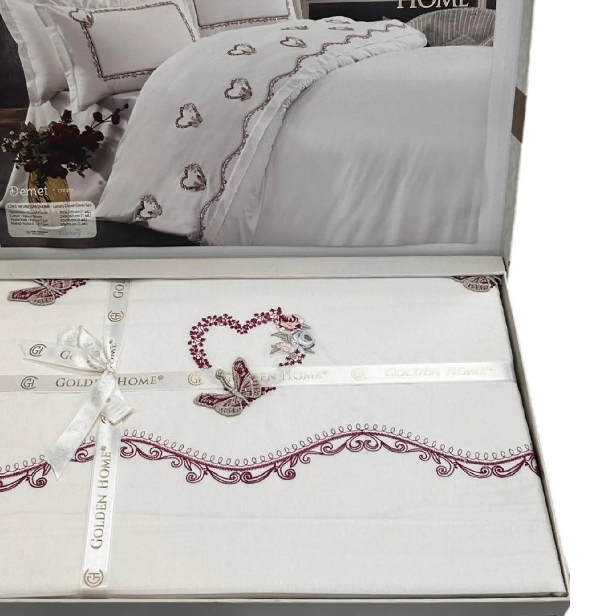 Add a touch of romance to your bedroom with the elegant Demet Duvet Set. This set features a crisp white base adorned with intricate burgundy/maroon heart and butterfly embroidery details, including a scalloped duvet border. The set includes a duvet cover, flat sheet, and four pillowcases, perfect for a complete, luxurious look.