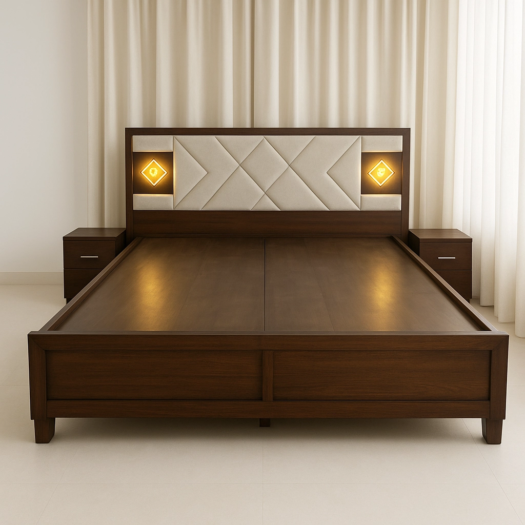 This elegant King Size bed features a rich dark wood frame, a cream-colored diamond-quilted upholstered headboard with striking integrated illuminated panels, and convenient attached two-drawer nightstands.