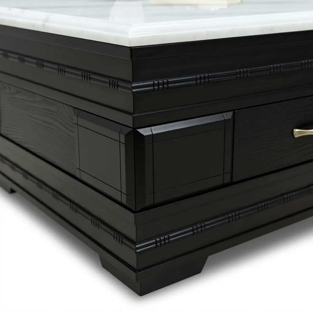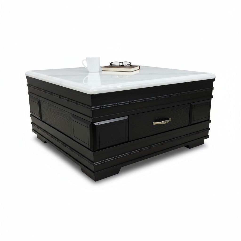 This stately coffee table features a dramatic contrast with its dark wood base, detailed paneling, and a bright white marble top. A single, textured storage drawer with a polished gold-tone handle offers a blend of elegance and practicality for a traditional living space.