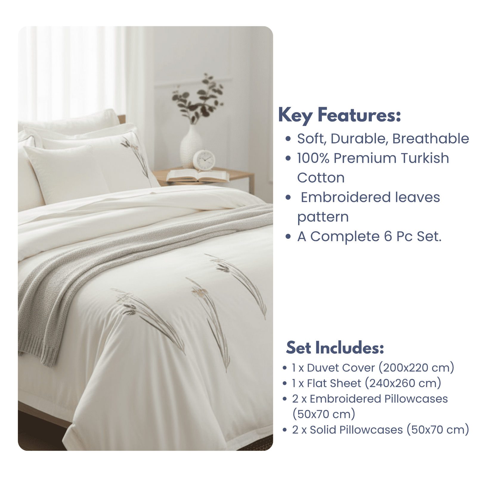 This elegant 6-piece Turkish cotton duvet set features a serene off-white color and delicate embroidered iris or floral stalks along the duvet and pillowcases. It offers a soft, luxurious feel and brings a subtle, refreshing touch of nature to your bedroom.