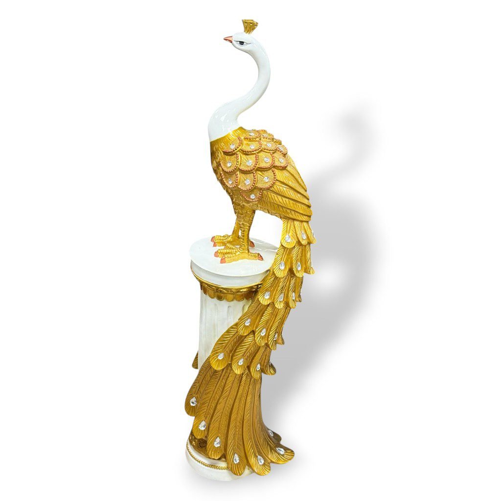 This magnificent golden peacock sculpture stands as a luxurious symbol of beauty, royalty, and good fortune, adding a dramatic, opulent accent to any classic or contemporary living space.