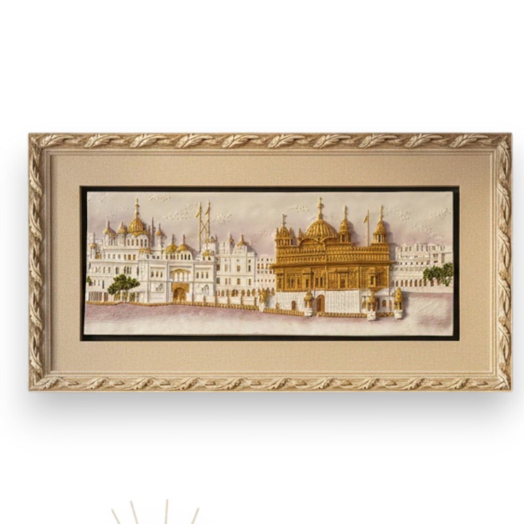 This framed embossed art piece beautifully captures the full panorama of Sri Harmandir Sahib, with the golden domes standing out against the white marble. The ornate gold and cream frame enhances the spiritual and architectural grandeur of the holy site.
