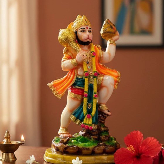 This dynamic statue depicts Lord Hanuman in his powerful, life-saving form, carrying the Dronagiri Mountain (Sanjivani Booti) in one hand. He stands with his signature weapon, the mace (Gada), symbolizing strength, devotion, and courage.