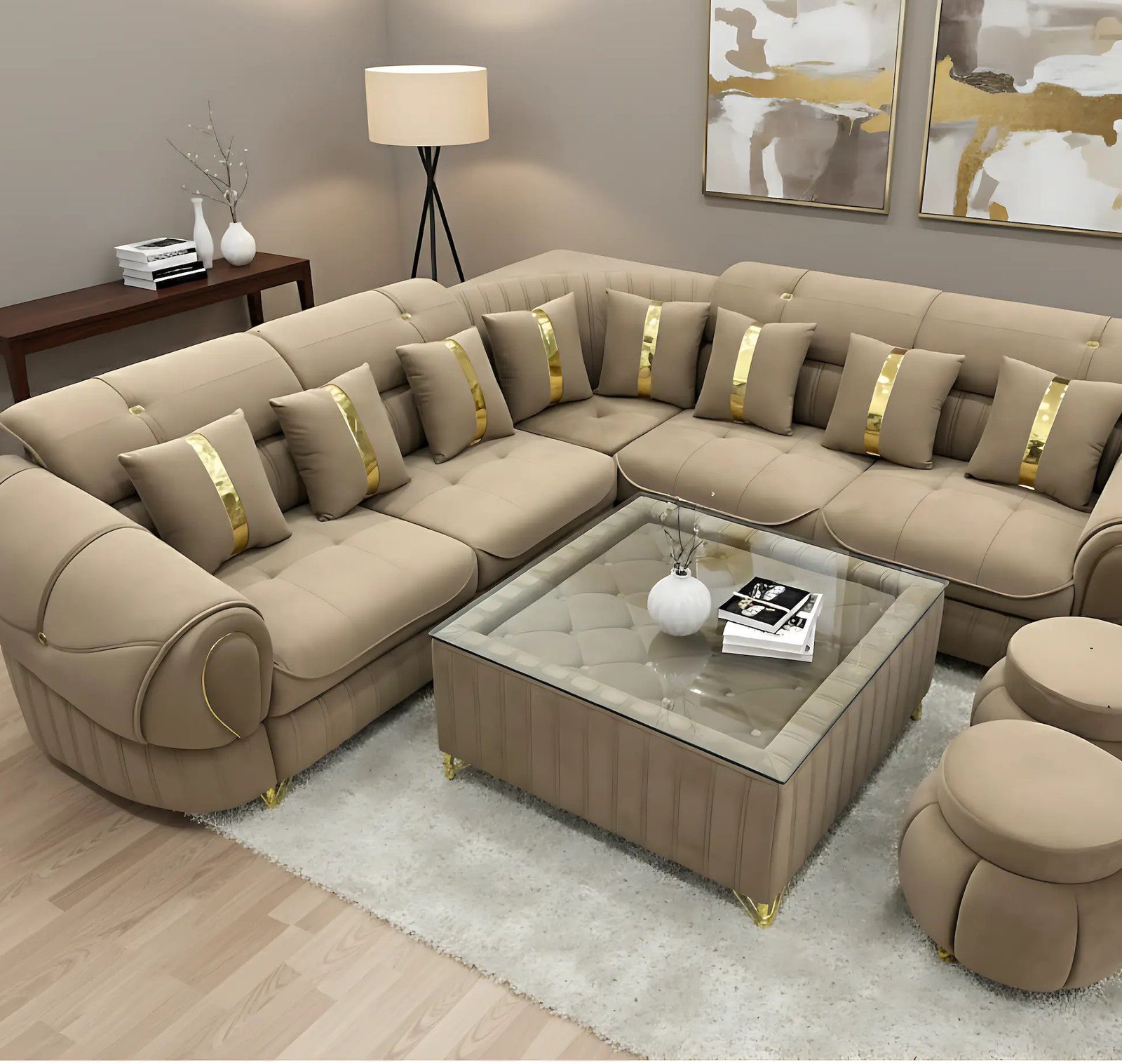 This elegant, L-shaped sectional sofa set is upholstered in a soft, beige fabric with classic tufting. The plush design is highlighted by striking gold-striped toss pillows. A matching glass-topped coffee table and two round ottomans complete the set, all supported by sleek gold legs for a touch of modern glam.