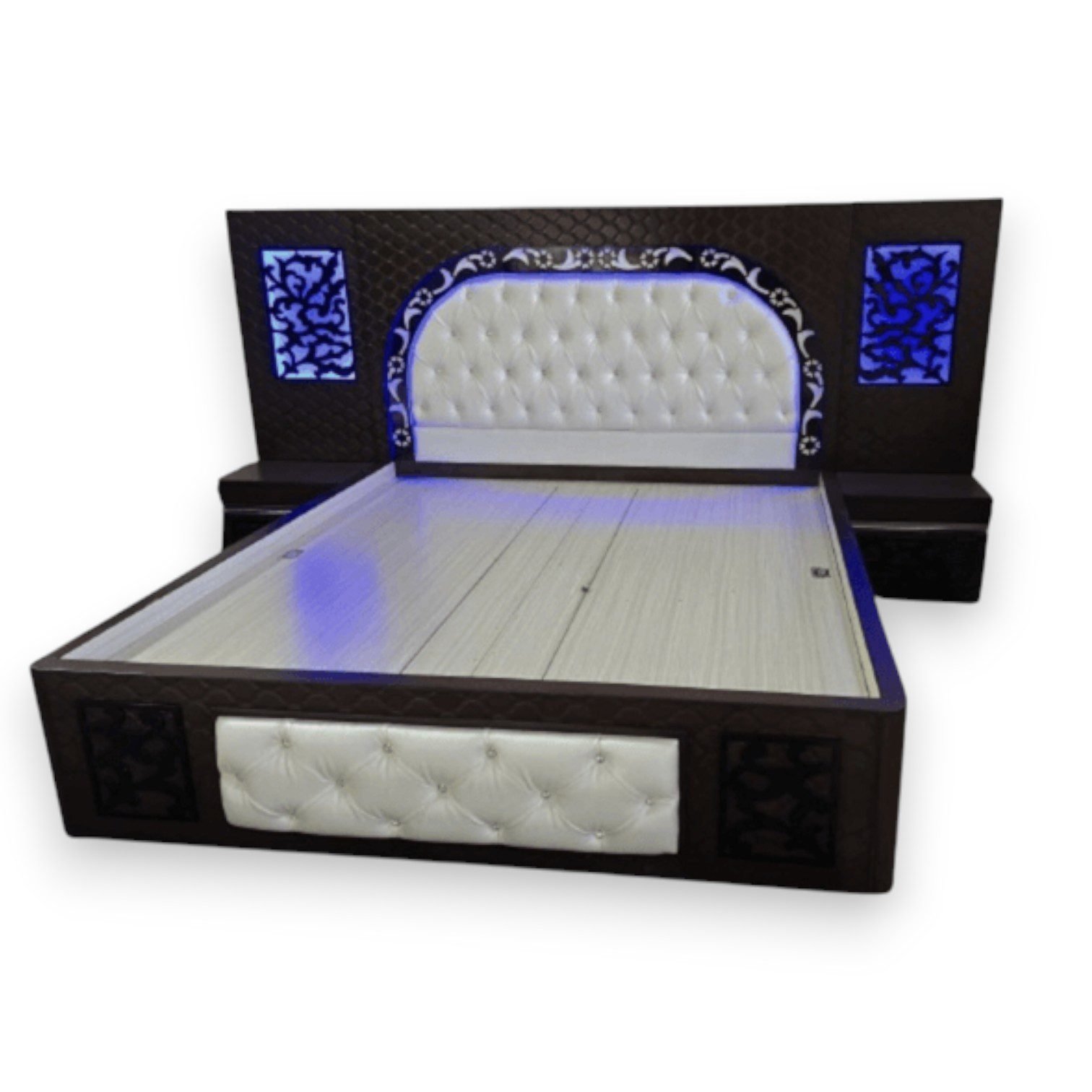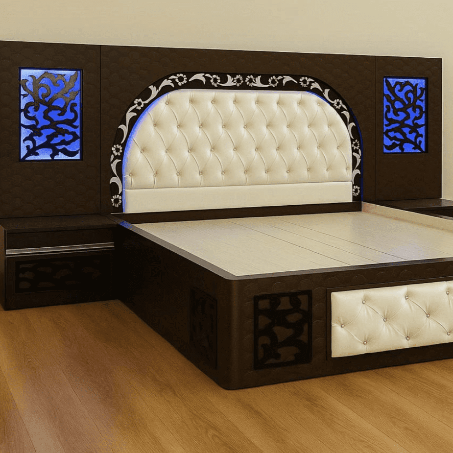 Elevate your bedroom with this premium king size bed, crafted from high-quality wood and featuring an elegant tufted upholstered headboard with LED backlit panels. The intricate floral cutwork and soft leatherette finish add a touch of luxury, while the spacious design ensures maximum comfort. Perfect for modern homes, this bed blends durability with contemporary style.