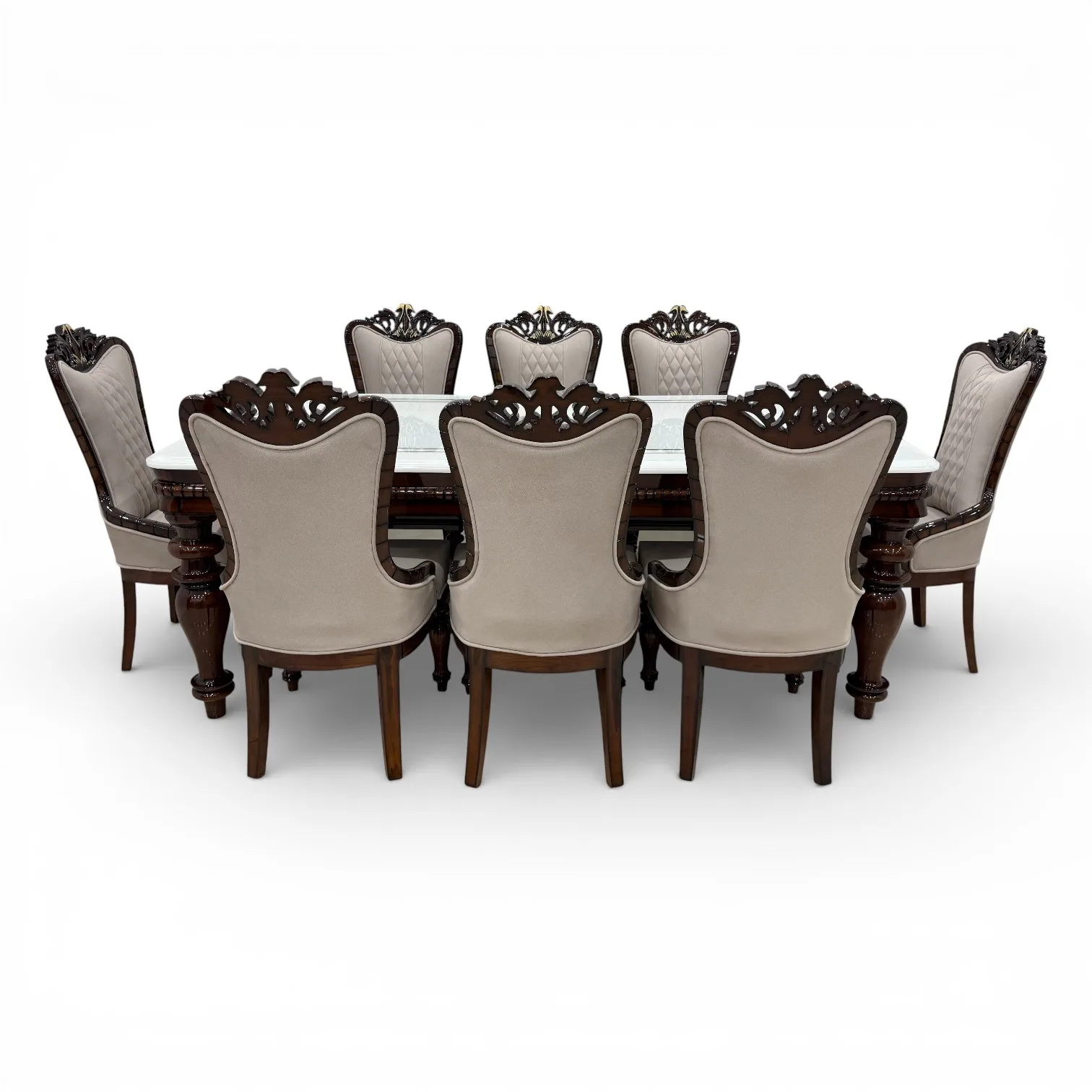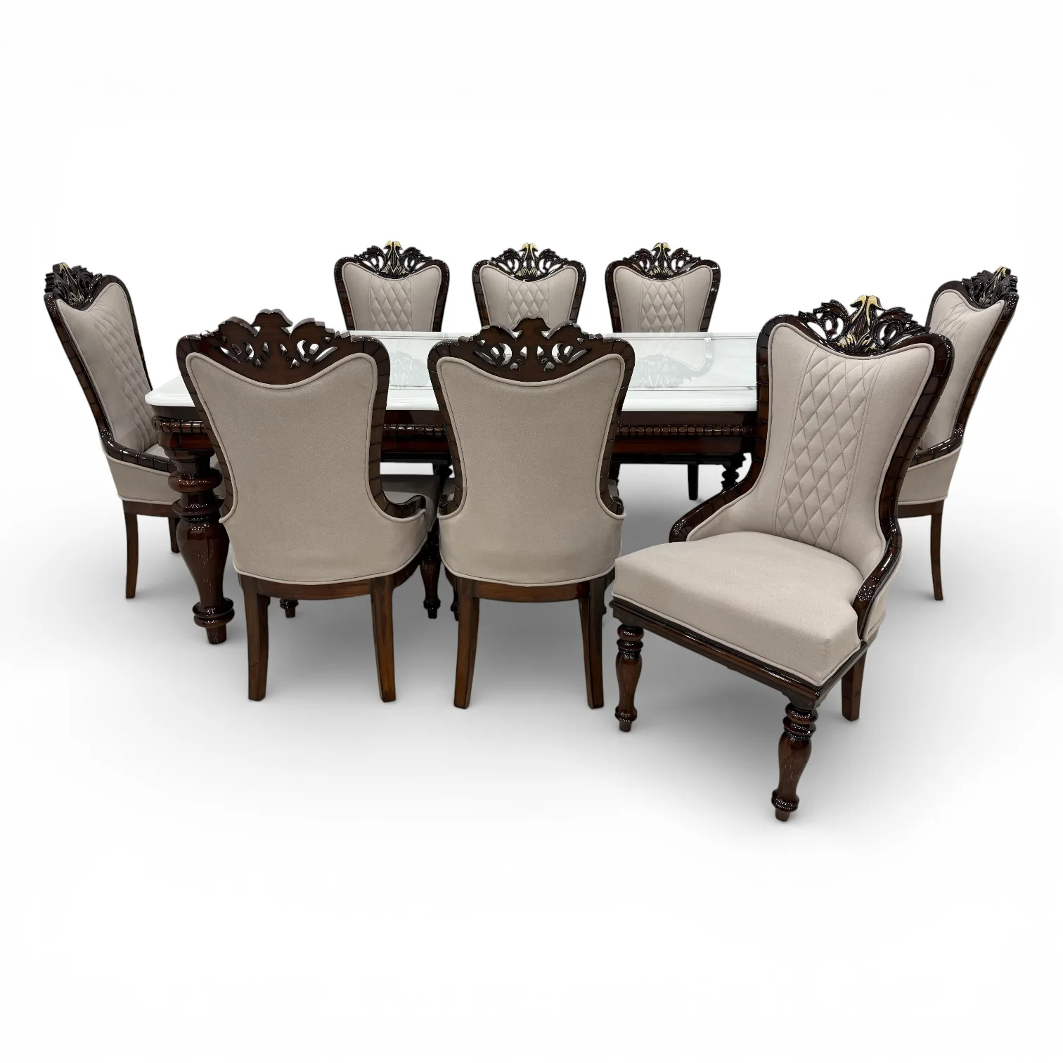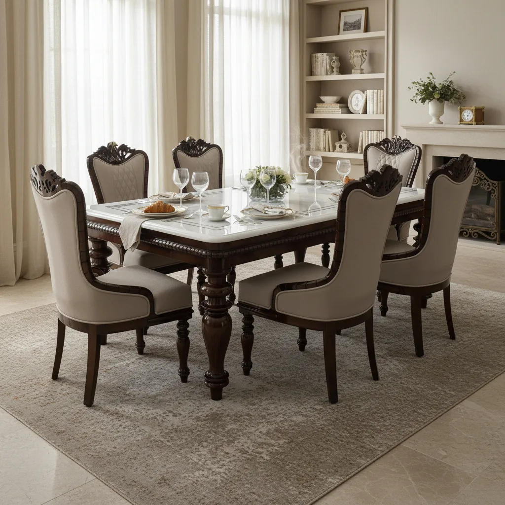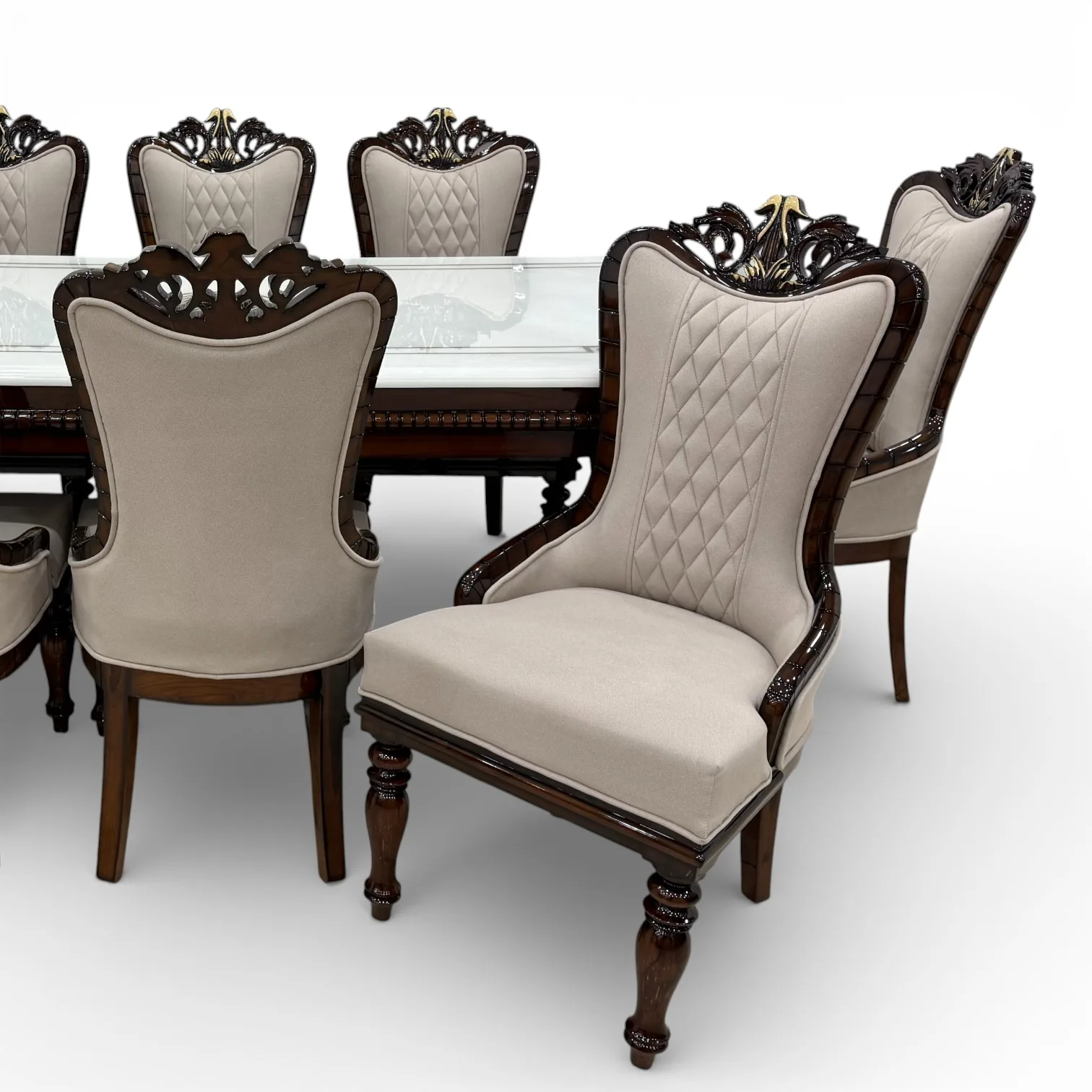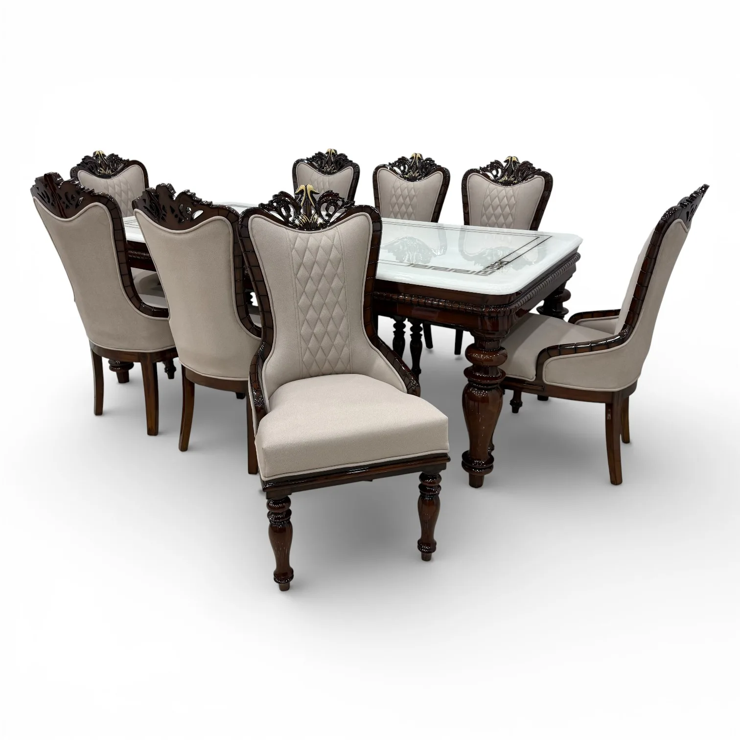 Luxury Royal 6 Seater Dining Table Set with Hand-Carved Upholstered Chairs