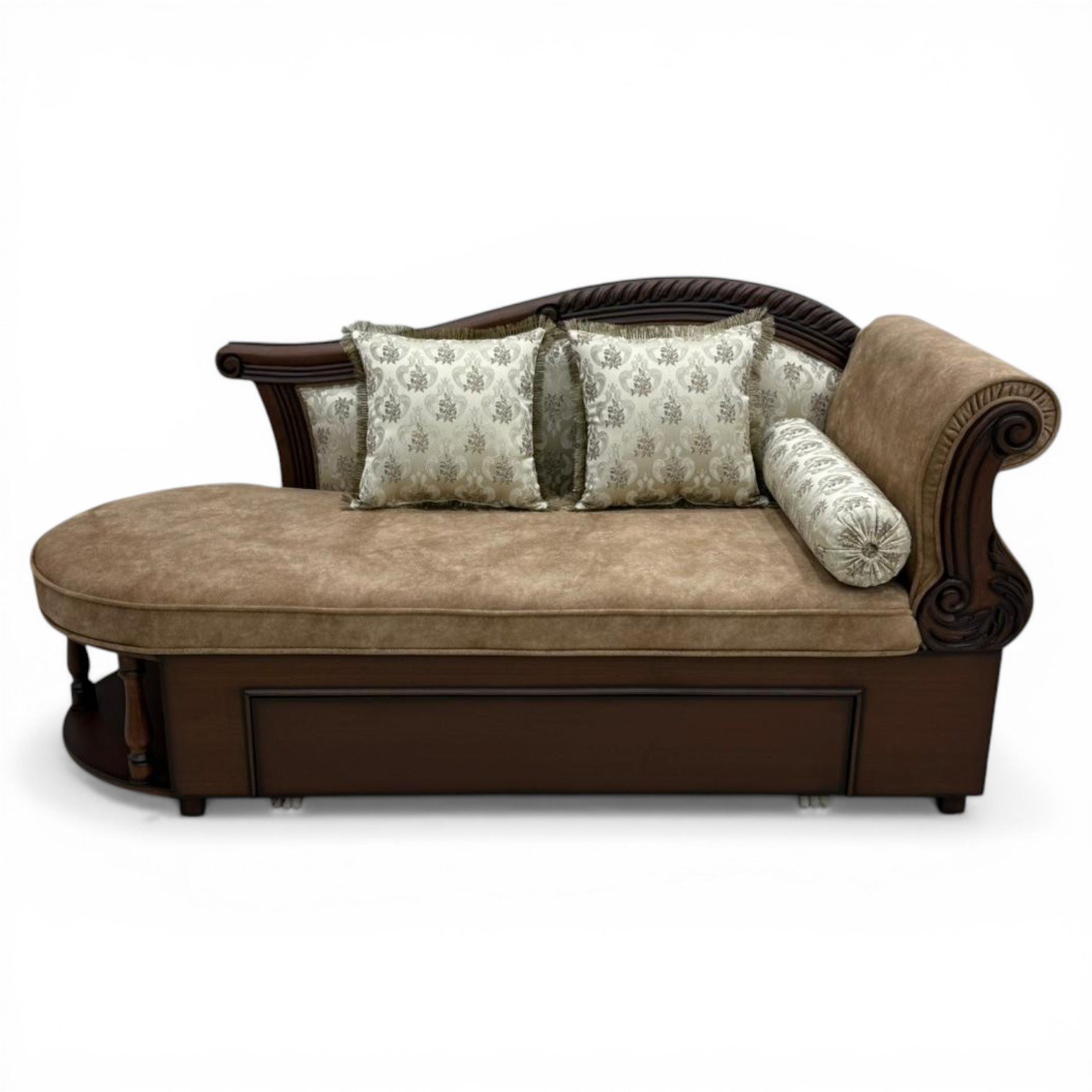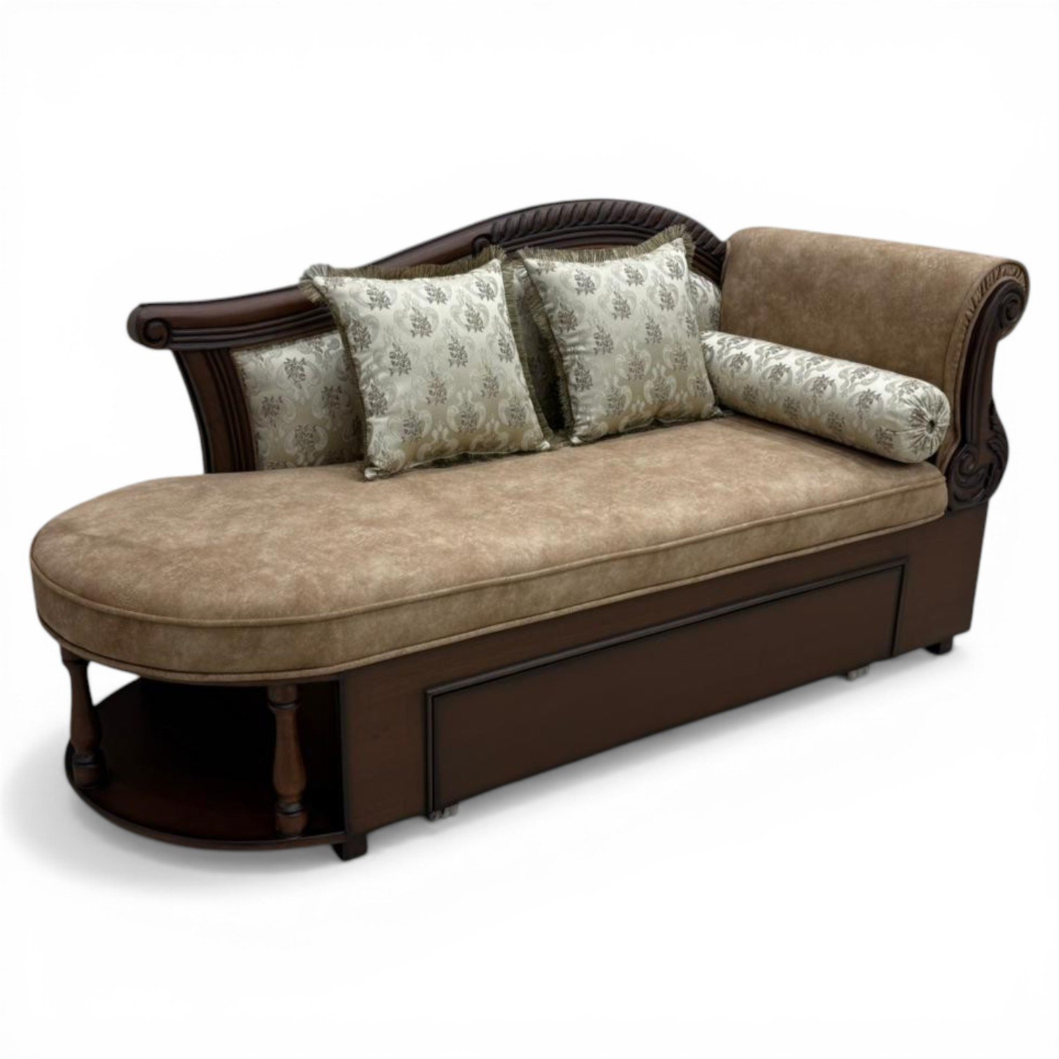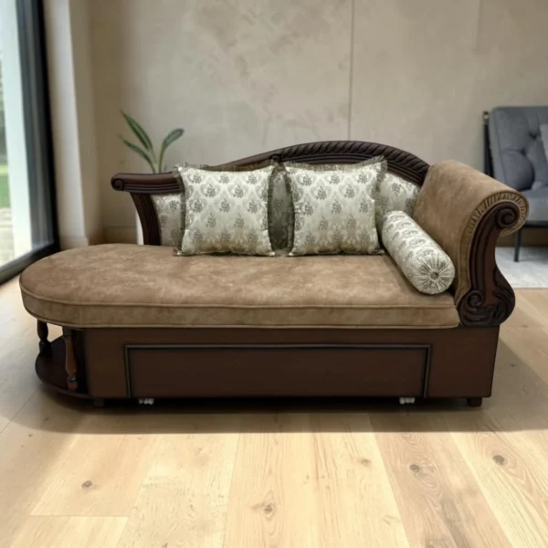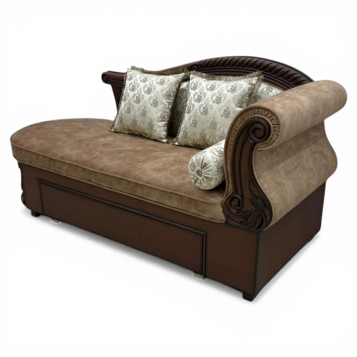 Elegant curved design with rich wood detailing and plush cushioning—perfect for adding a regal, relaxing statement to your space.