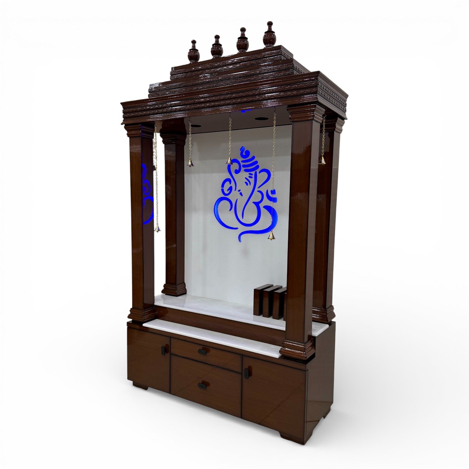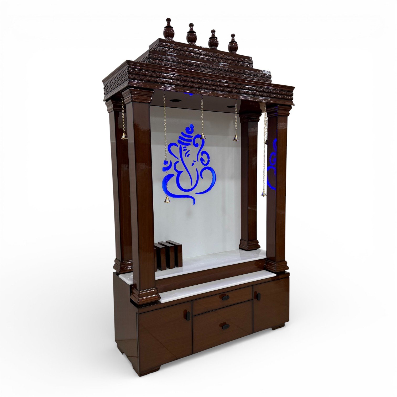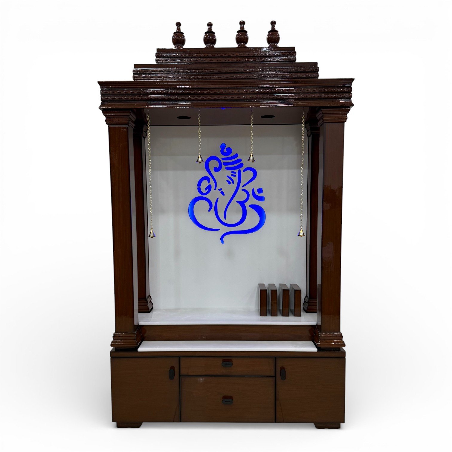 A beautifully crafted wooden temple featuring elegant pillars, soft LED backlit Ganesh artwork, and spacious storage—perfect for serene and modern home pooja spaces.