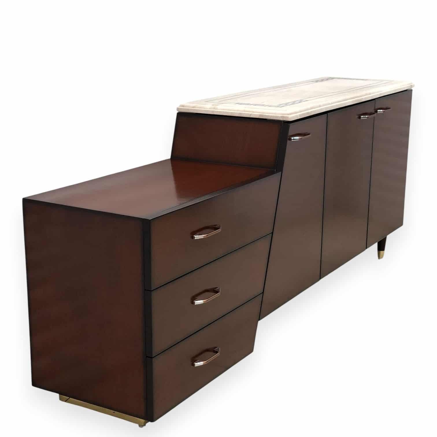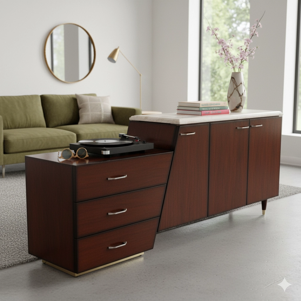 A stunning blend of vintage design and contemporary luxury, this sideboard features rich wood tones, angular lines, and a premium white marble surface.