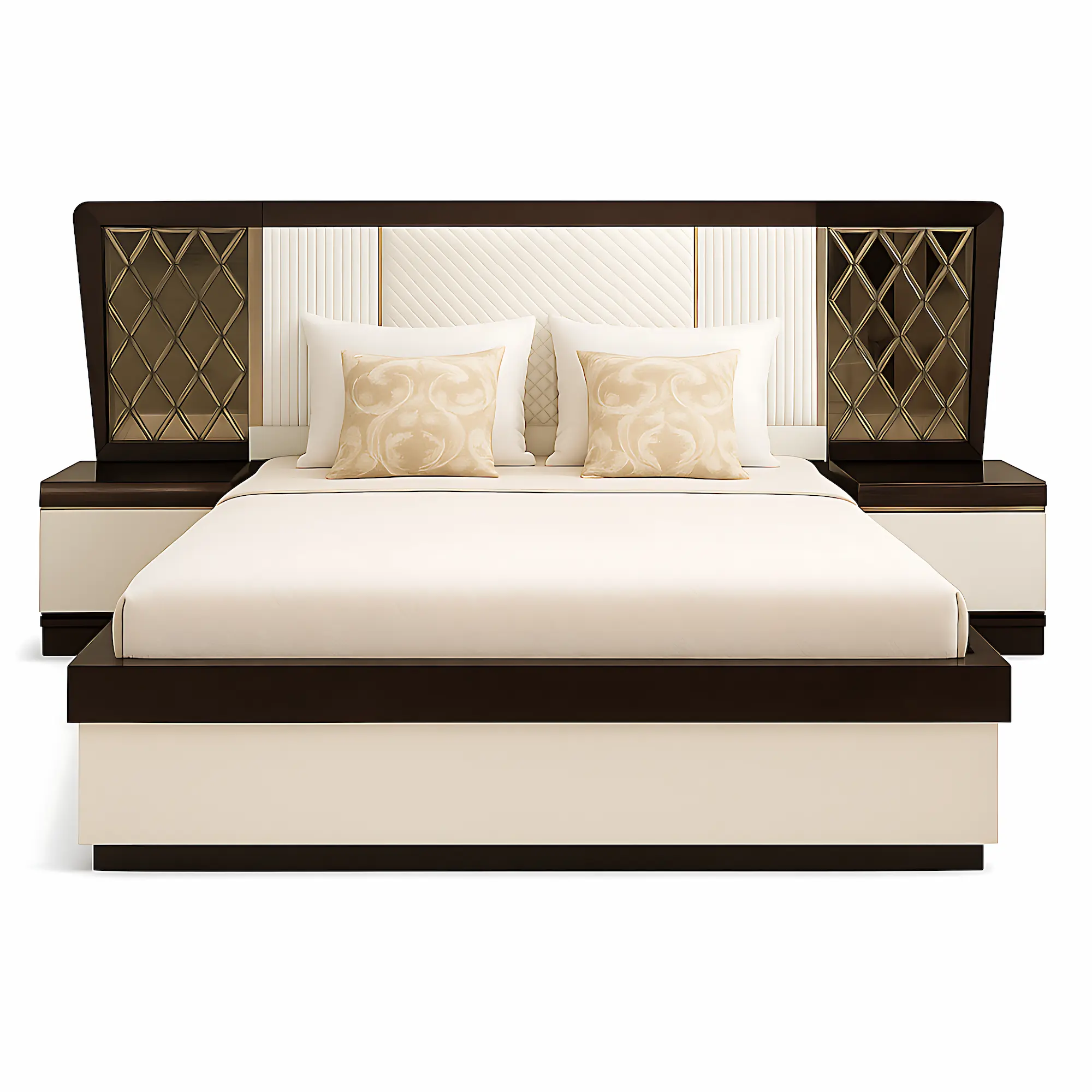 Contemporary king size bed featuring a diamond-pattern headboard with mirror accents, smooth wood finish, and matching side tables. Sized 300x215x150 cm, it brings luxury, elegance, and functionality to any bedroom.