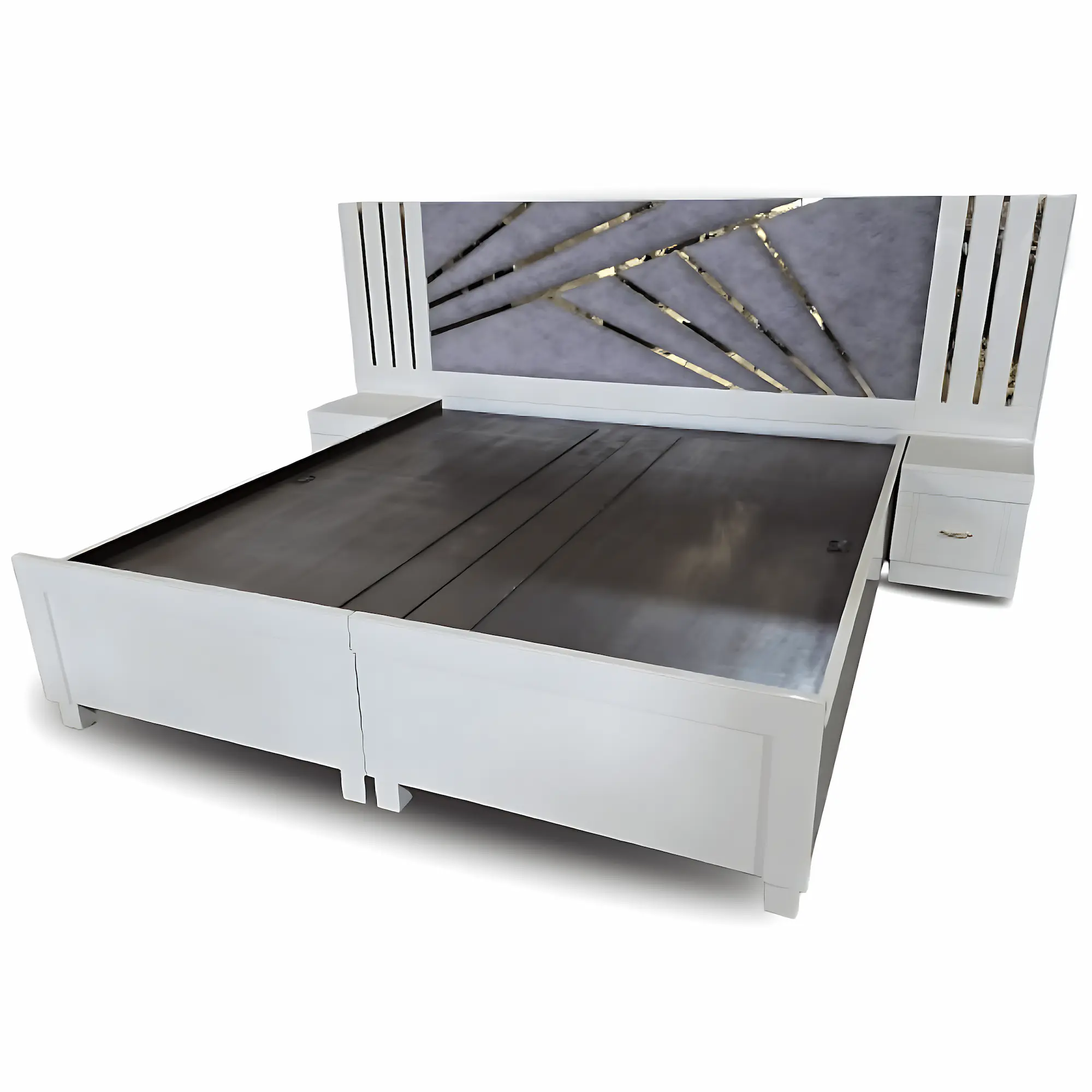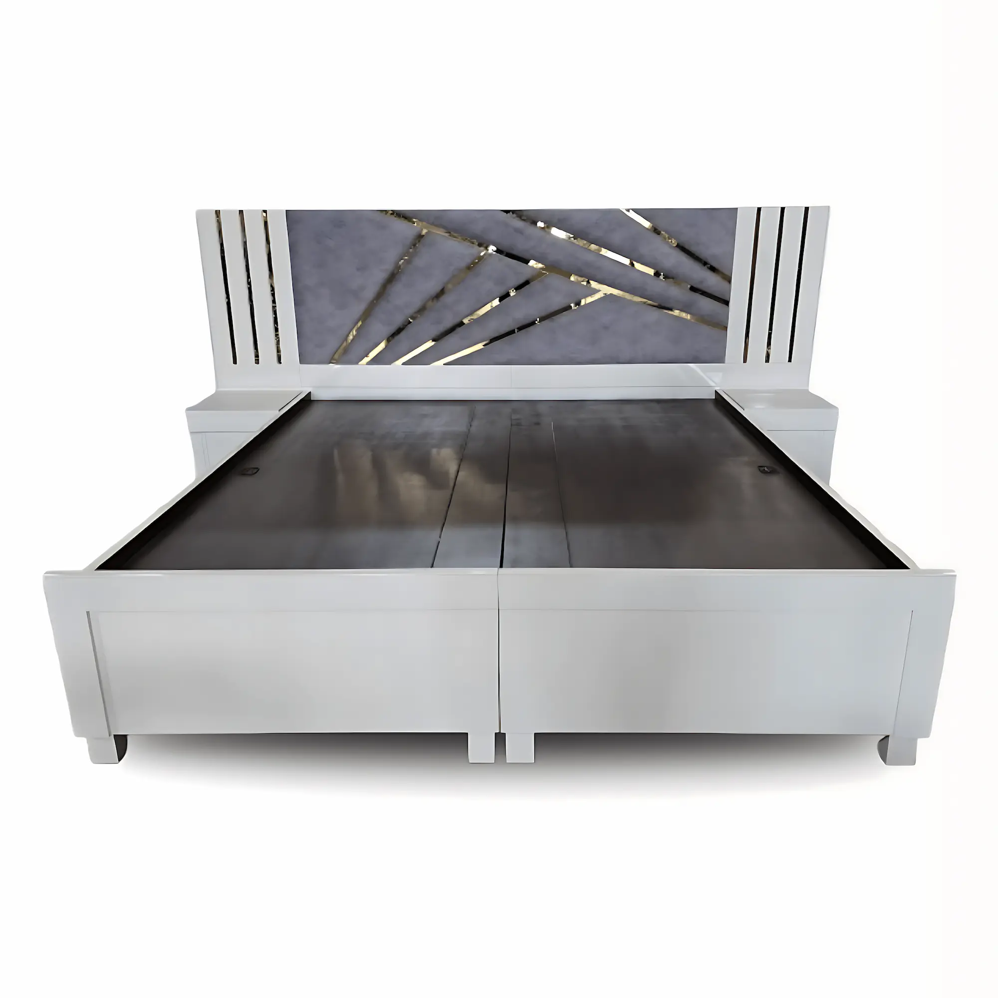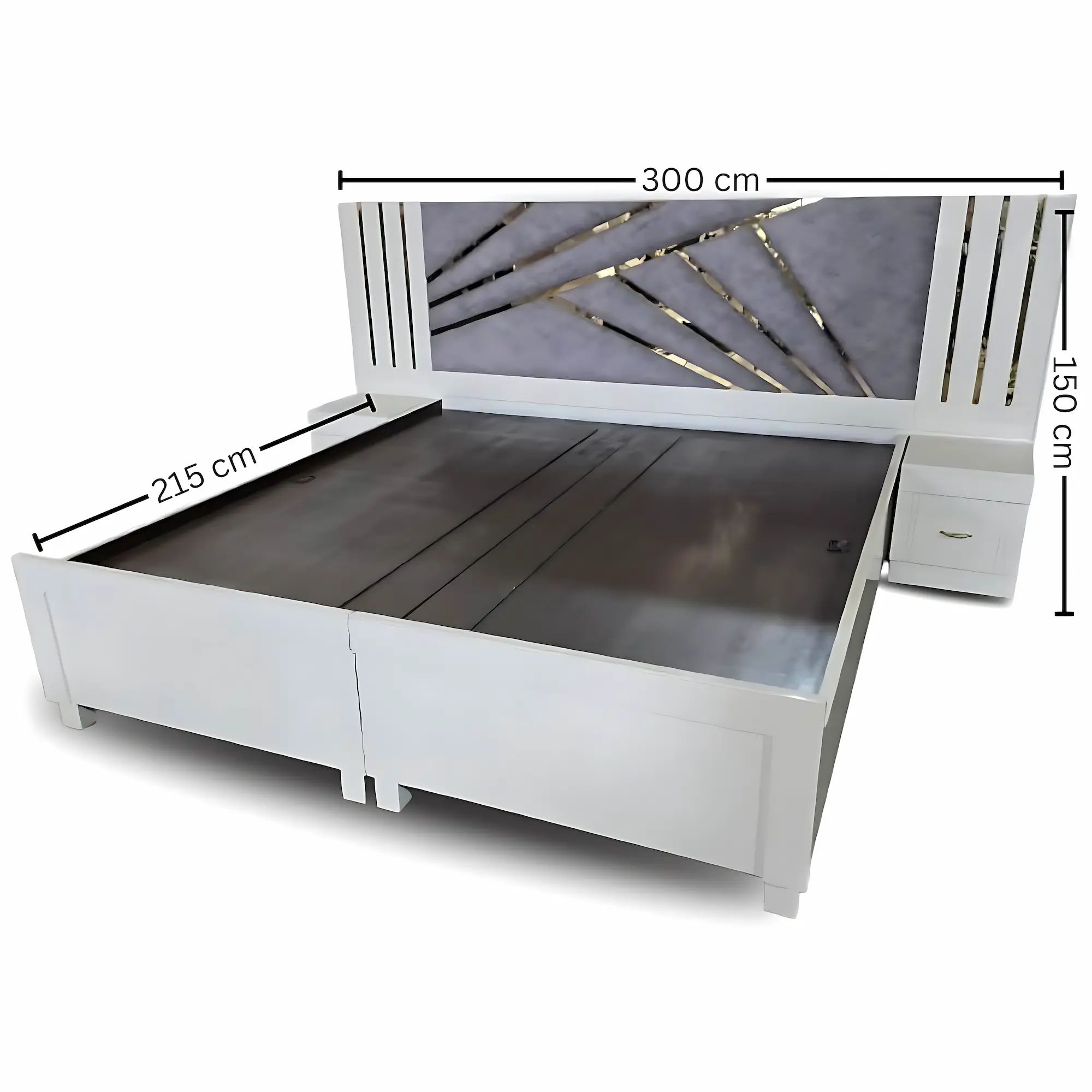 Add a touch of elegance to your bedroom with this modern white king size bed, featuring a sleek contemporary design and a stunning headboard with geometric golden accents over a soft textured panel. Crafted for durability and style, it comes with side storage units to blend functionality with luxury. Perfect for creating a sophisticated and calming bedroom ambiance.