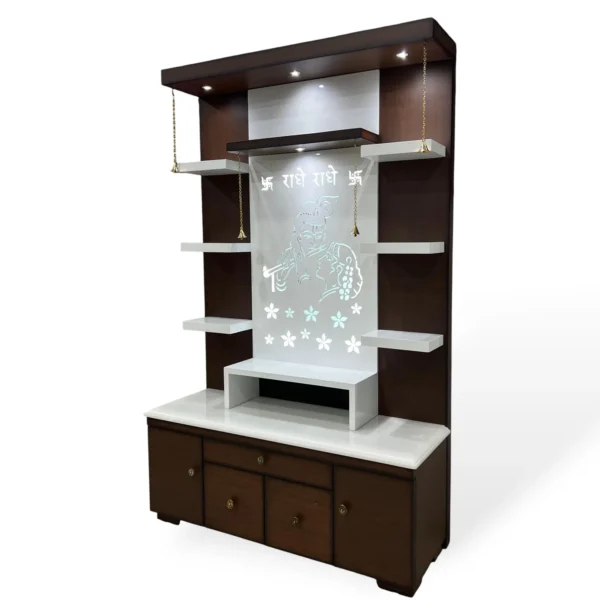 A contemporary two-tone pooja mandir featuring integrated lighting, decorative shelves, and a devotional LED Radha Krishna backdrop with lower storage cabinets.