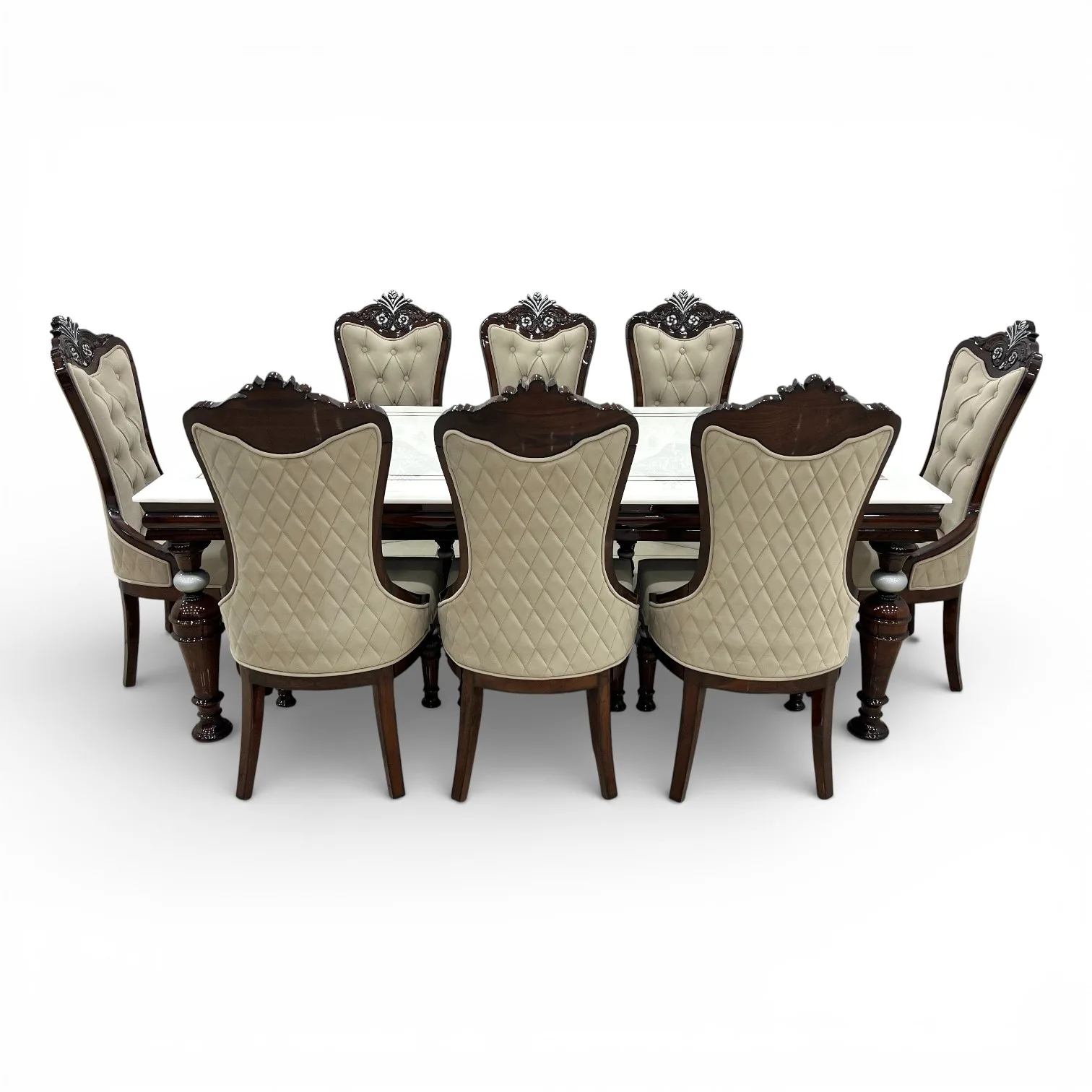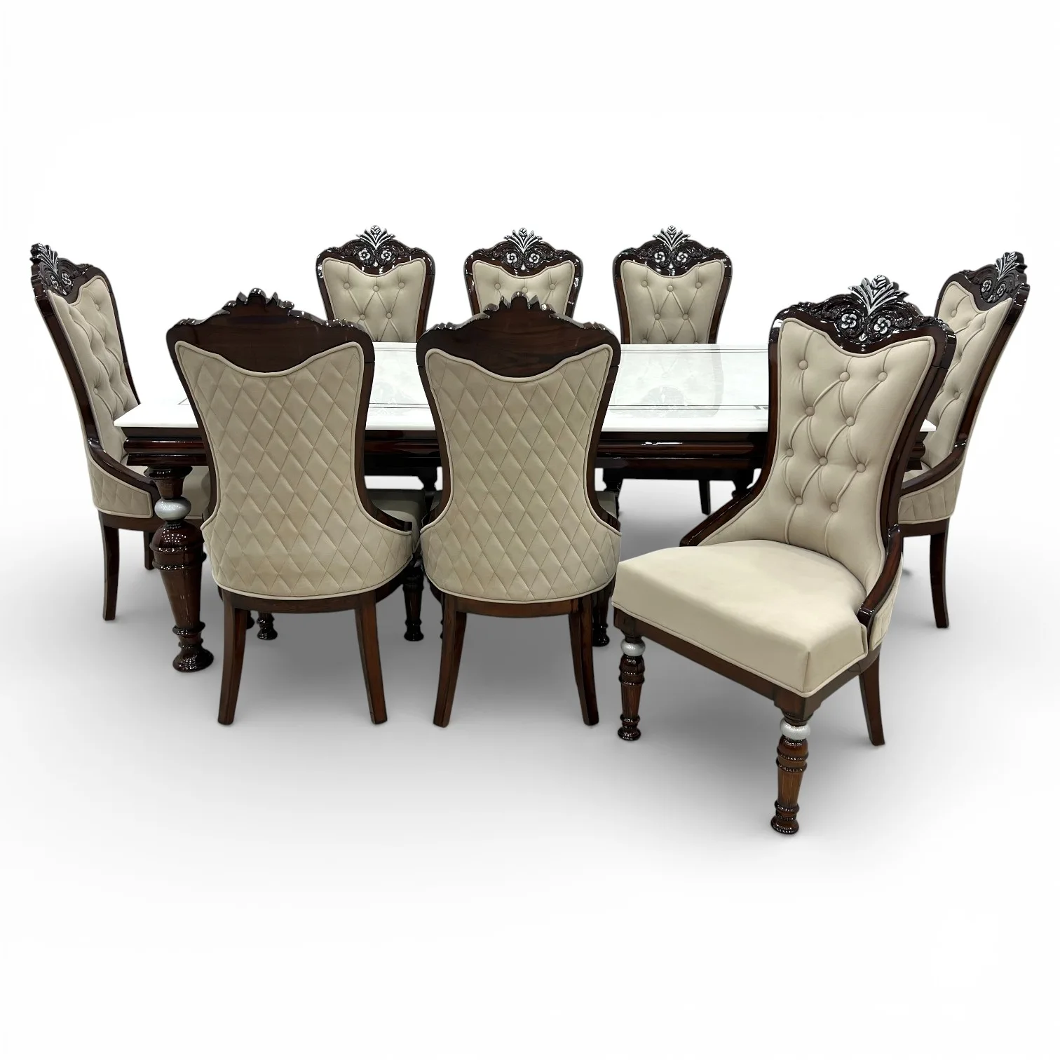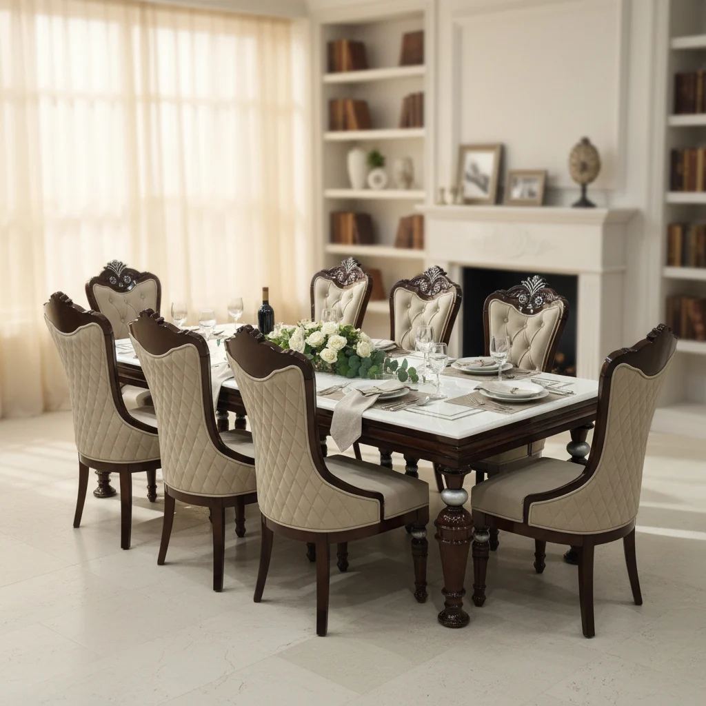 Premium 8-Seater Marble-Top Dining Table Set with Carved Chairs