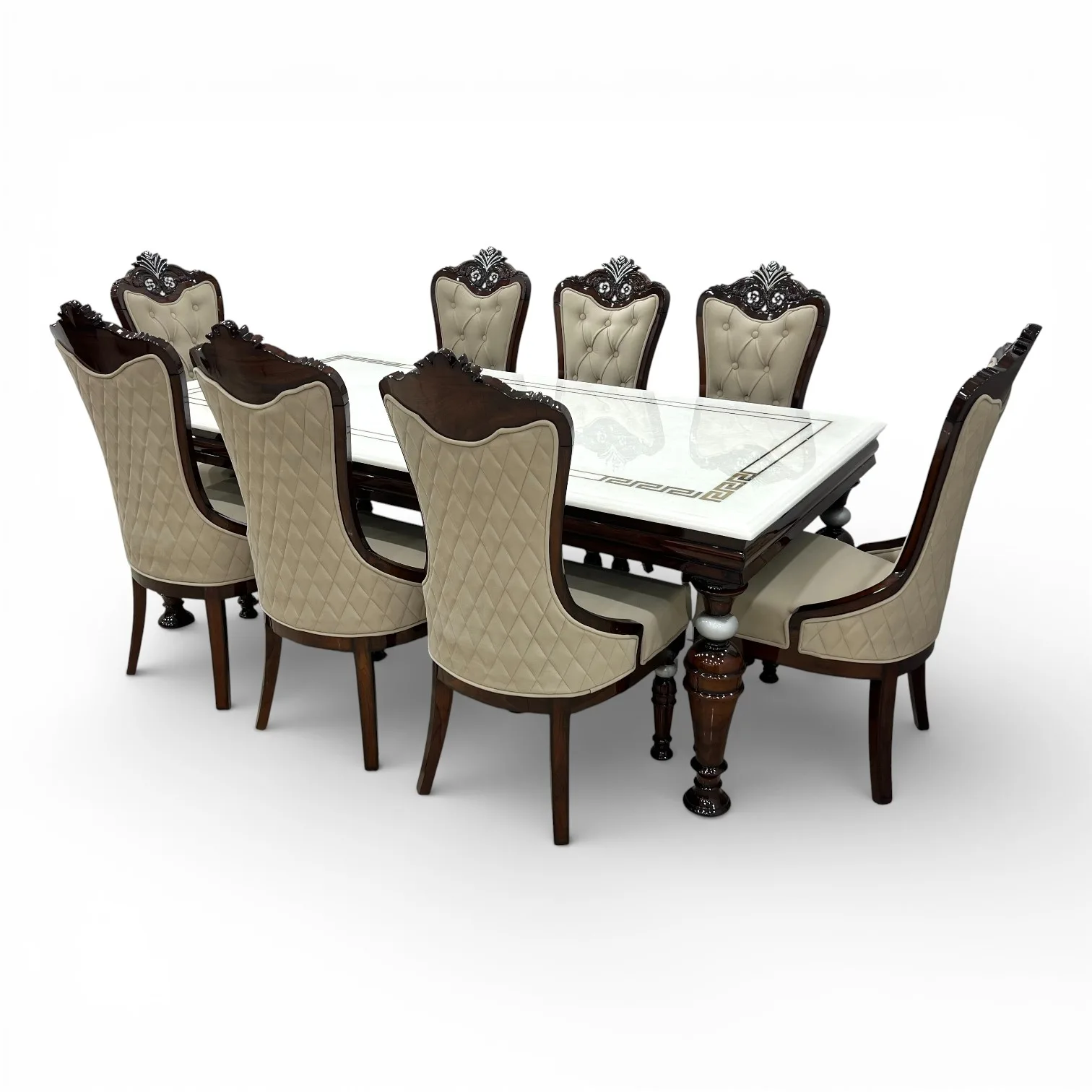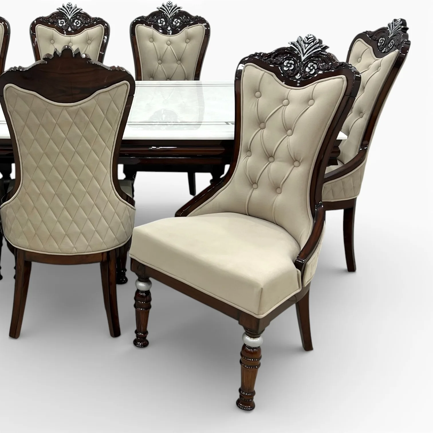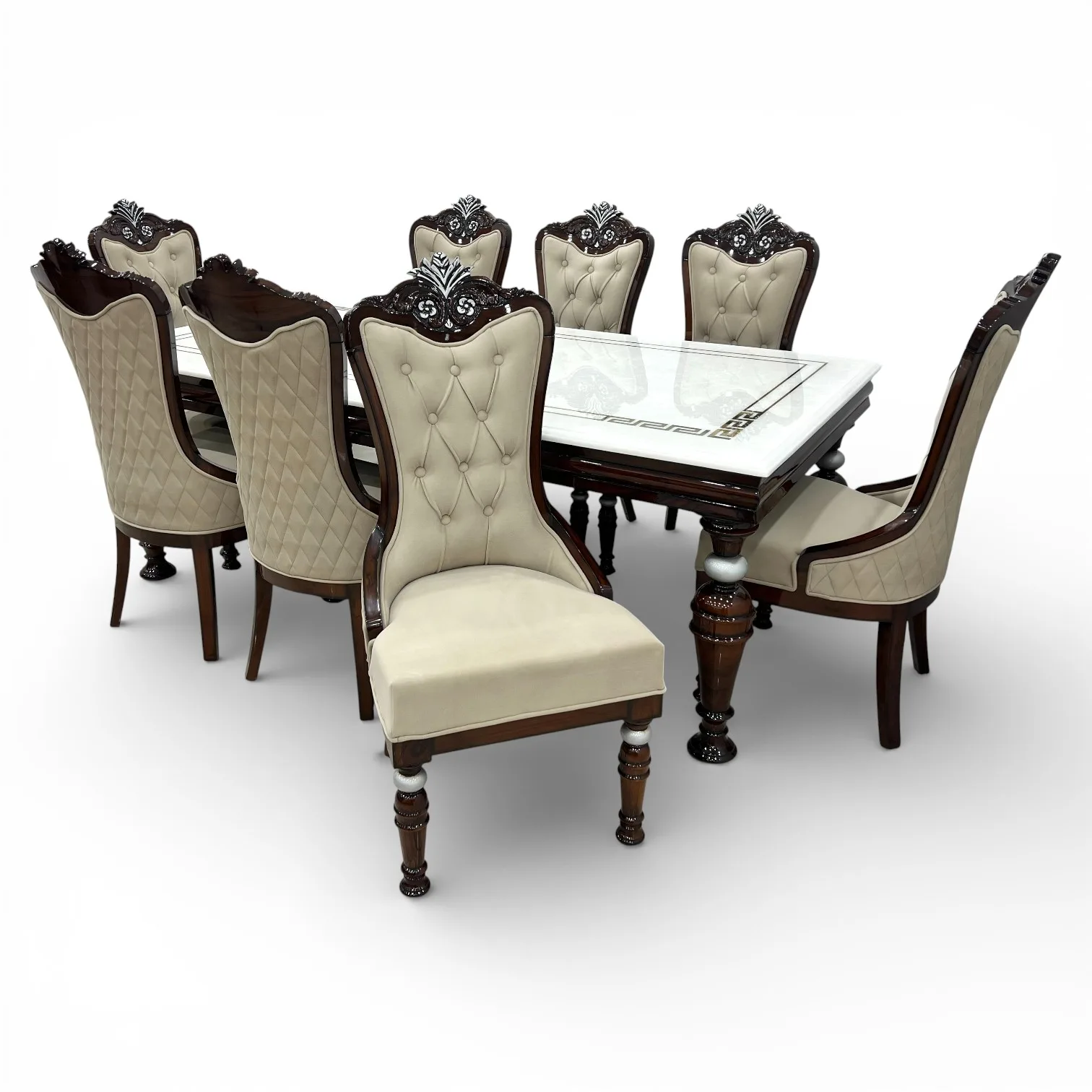 Premium 8-Seater Marble-Top Dining Table Set with Carved Chairs