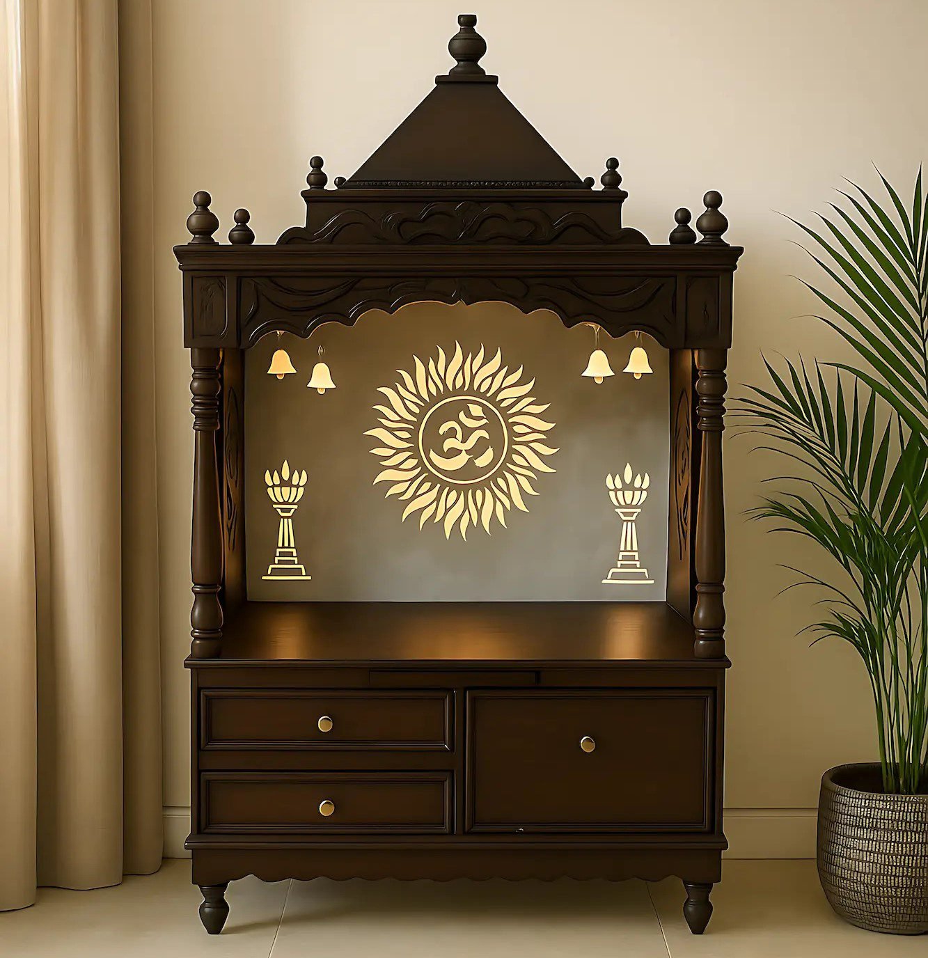 Exquisitely designed wooden mandir with glowing Om cutwork and spacious drawers. A perfect blend of tradition and elegance for your home temple.