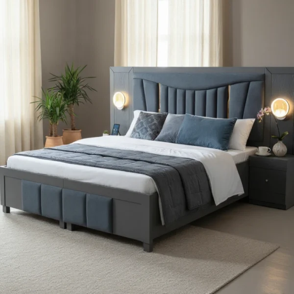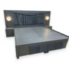 This contemporary design features an upholstered, winged headboard, dual integrated nightstands with ambient lighting, and large under-bed storage panels for ultimate convenience and style.