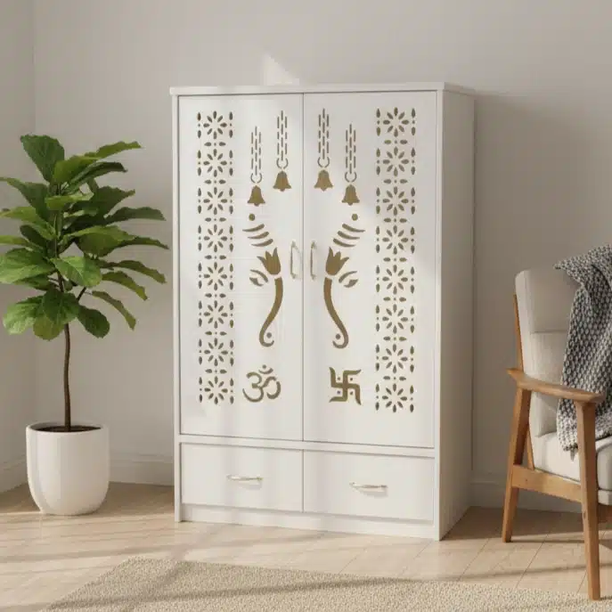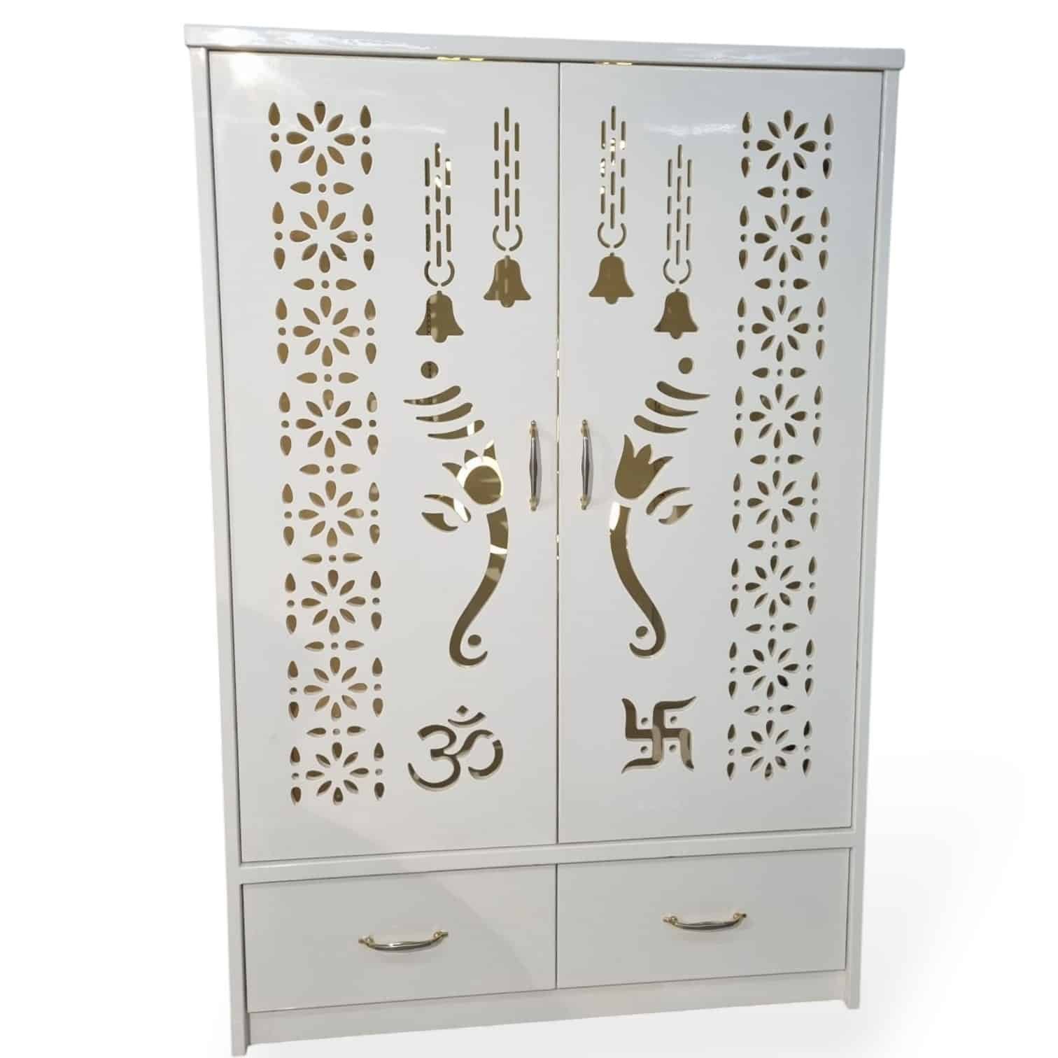 This modern, two-door pooja cabinet features a crisp white finish with intricate Ganesha face outlines, Om, Swastik, and bell symbols as gold-backed cutouts, offering two large drawers for spacious storage.