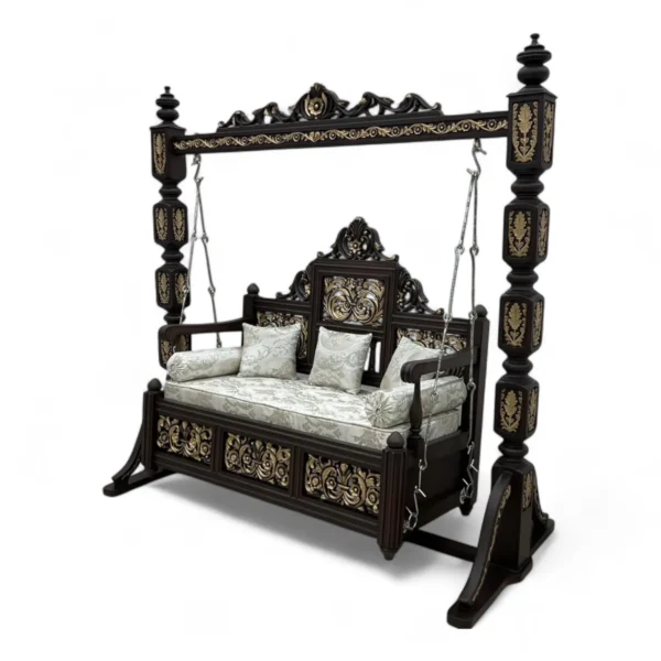 A stunning piece of heritage furniture featuring intricate floral carvings, rich dark wood, and vibrant gold leaf accents for a truly palatial look.