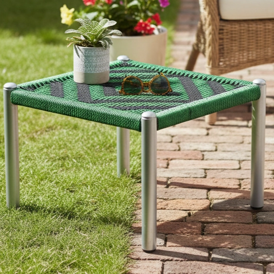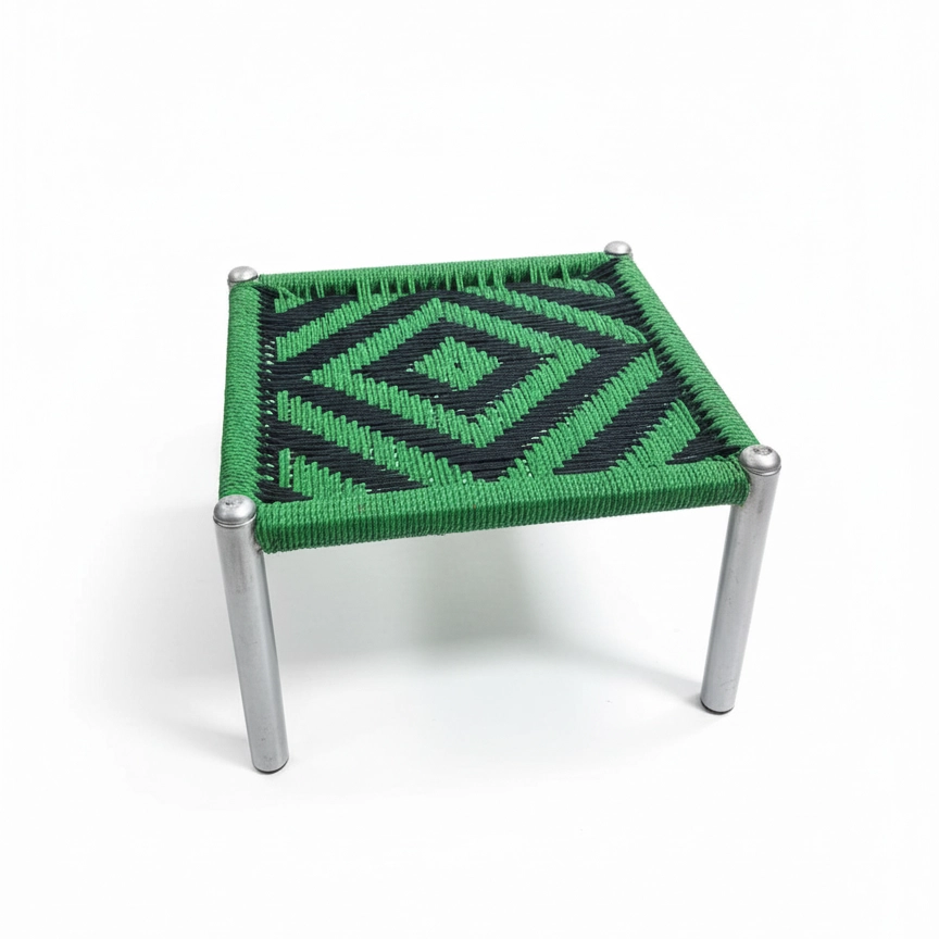 A classic, handwoven Peerhi featuring a vibrant green and black geometric pattern on a sturdy metal frame, reflecting authentic Punjabi craftsmanship.