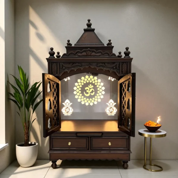 A beautiful carved wooden pooja mandir featuring functional jali doors, an LED Om backdrop, a classic dome, and lower storage drawers.