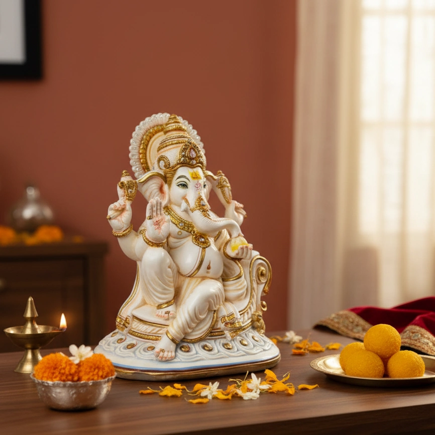 This elegant idol portrays Lord Ganesha, the Hindu God of beginnings, seated gracefully.
