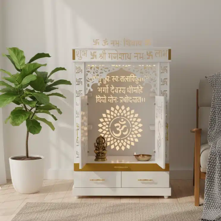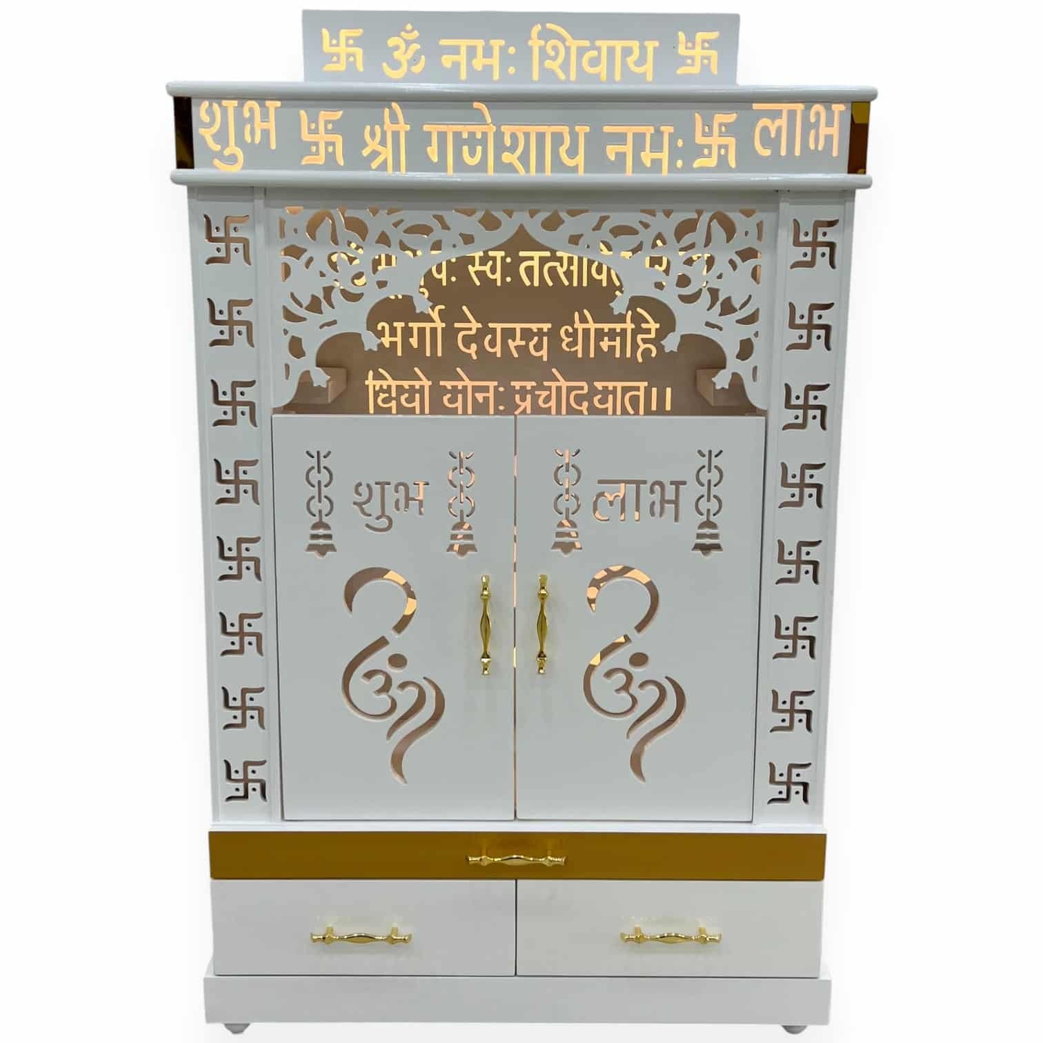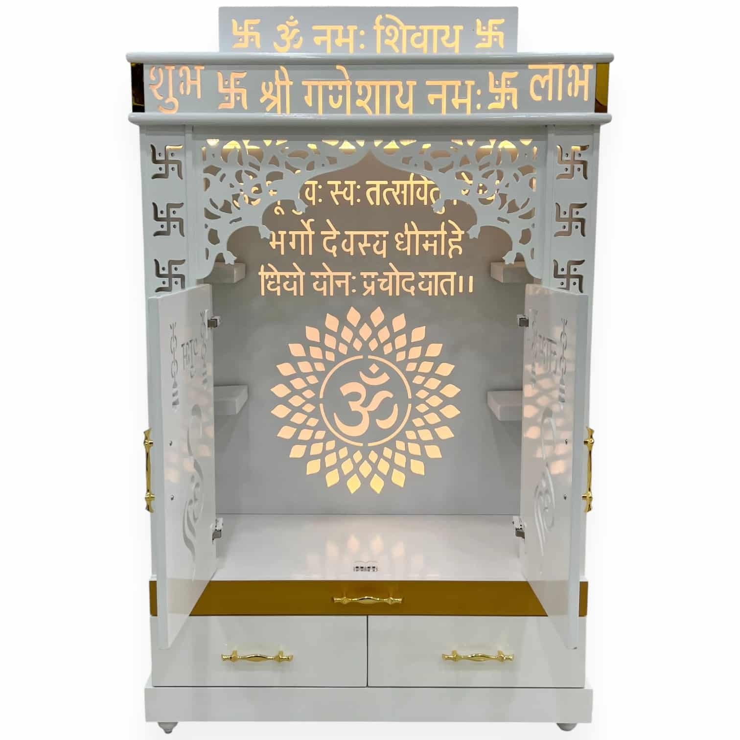 This elegant white mandir features a beautifully lit interior showcasing the Gayatri Mantra and Om symbol in gold-backed cutouts, surrounded by delicate lattice work and traditional Hindu symbols, offering practical storage with two drawers and a lower cabinet.